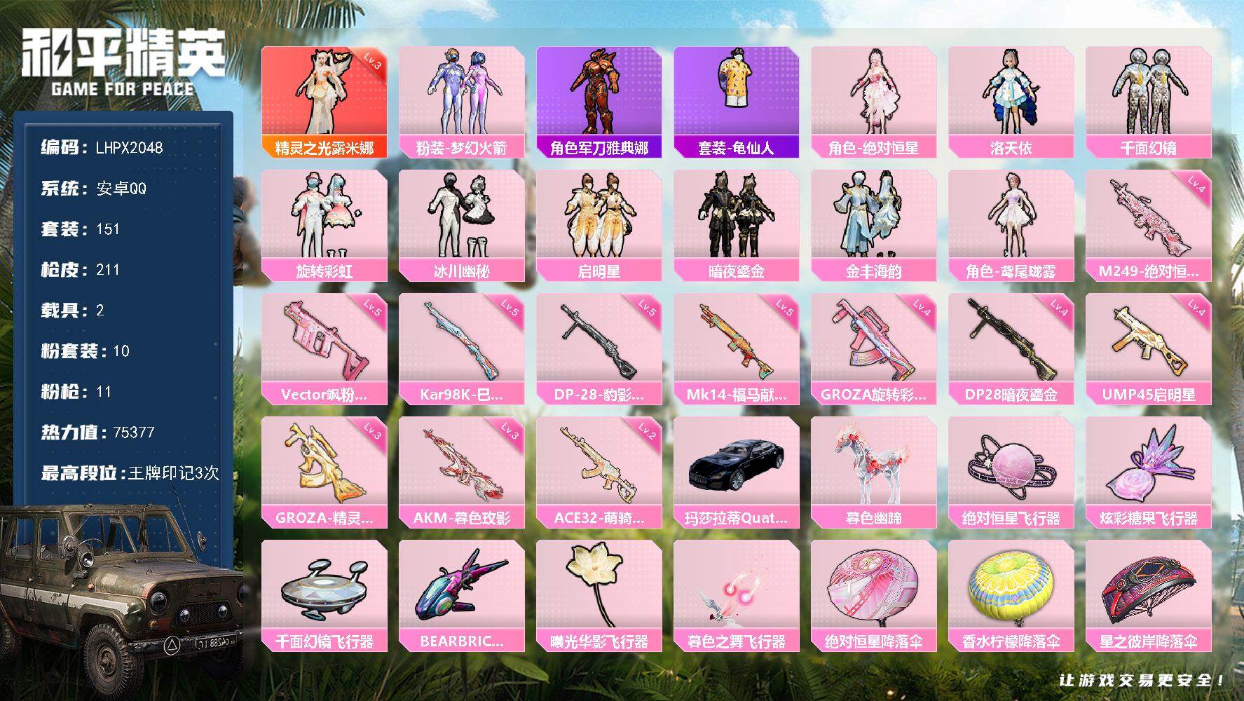 安卓手Q-21王牌印记-10粉装-15特效枪-3载具-热力值-3