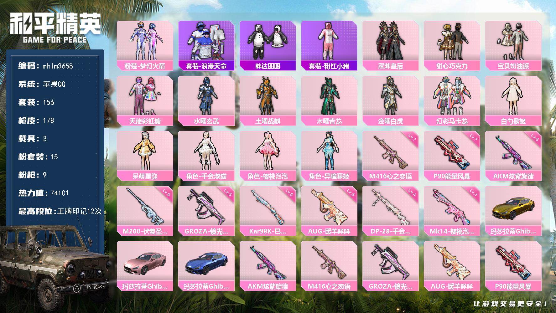 苹果 手Q-15粉装-9特效枪-3载具-1粉色飞行器-74101热力值-12王牌