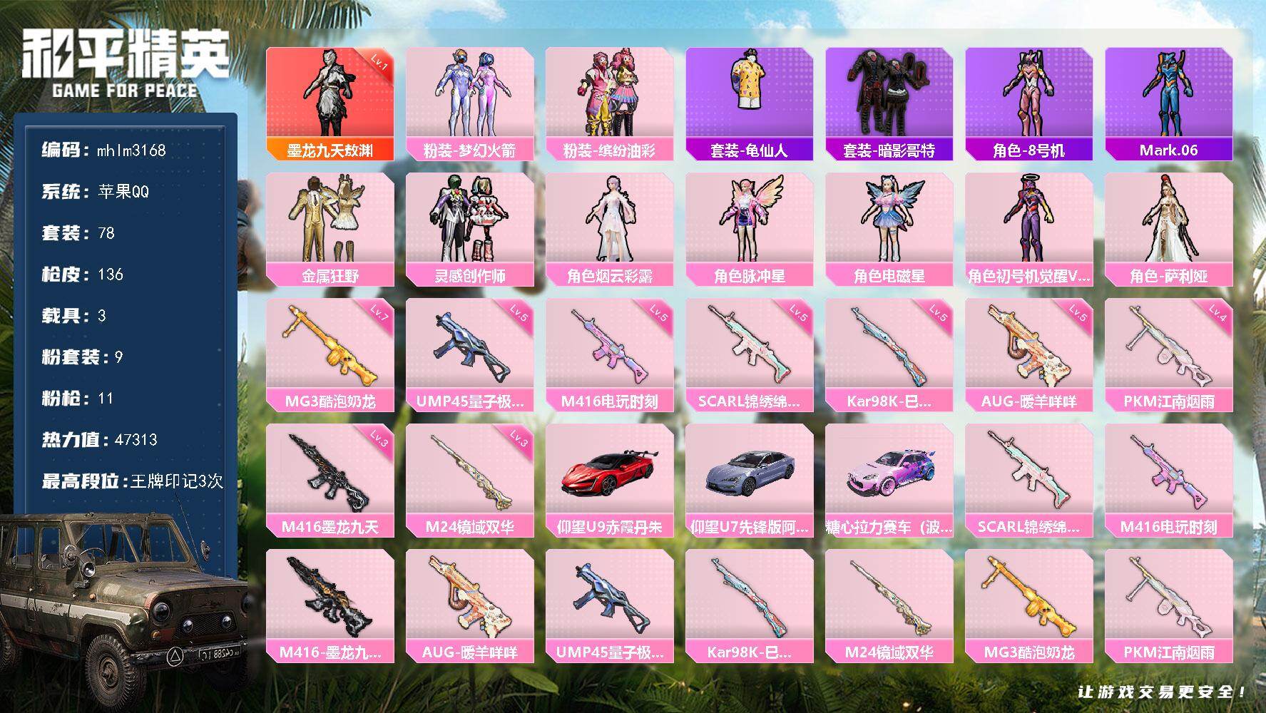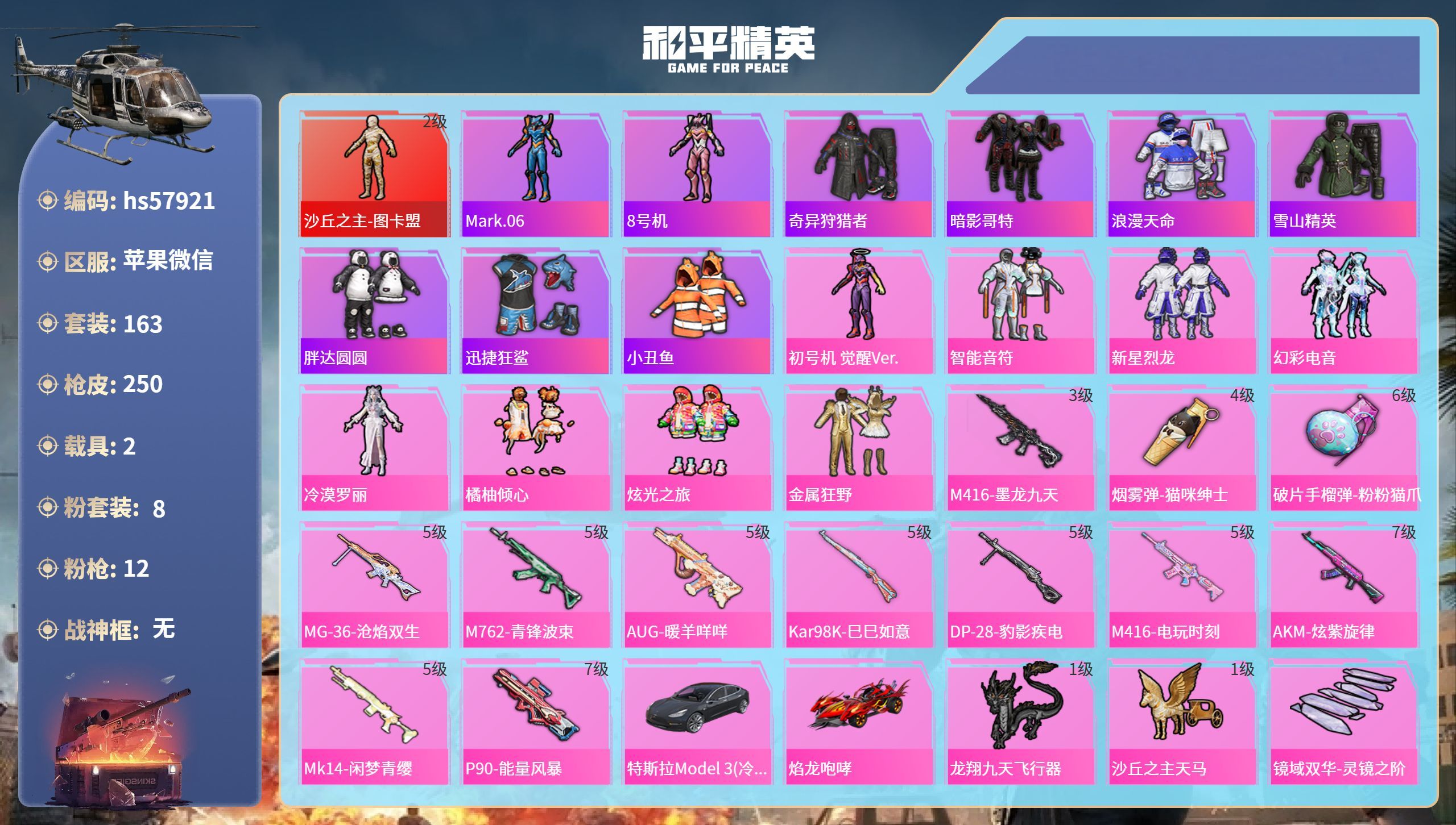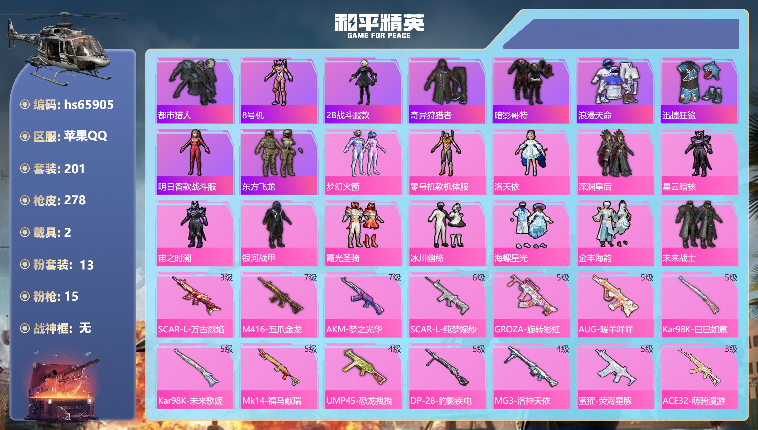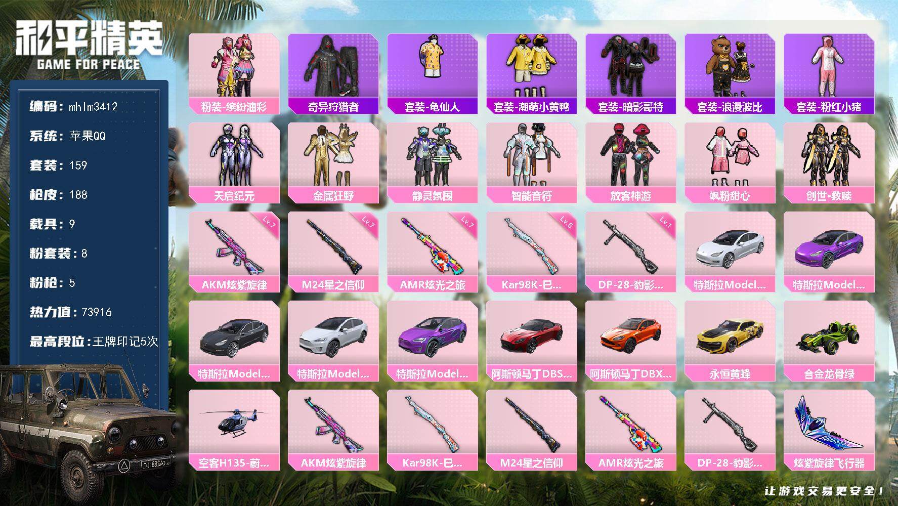 hs56412 苹果手Q-12王牌印记-有战神框-12粉装-5特效枪-1载具-63834热力值-15