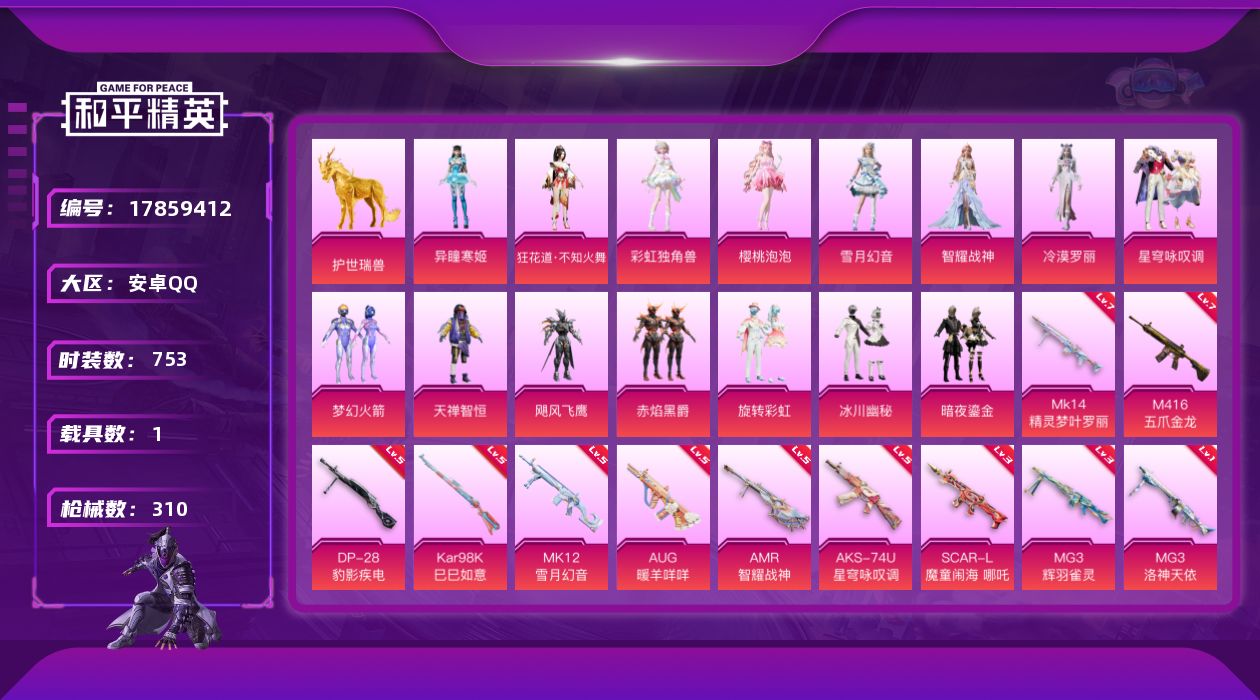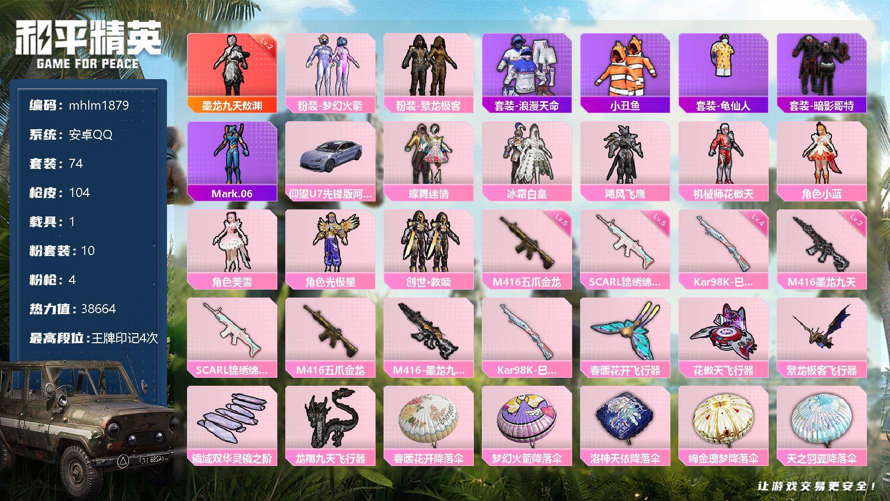安卓 手Q-1神装-10粉装-4特效枪-1载具-6粉色飞行器-38664热力值-