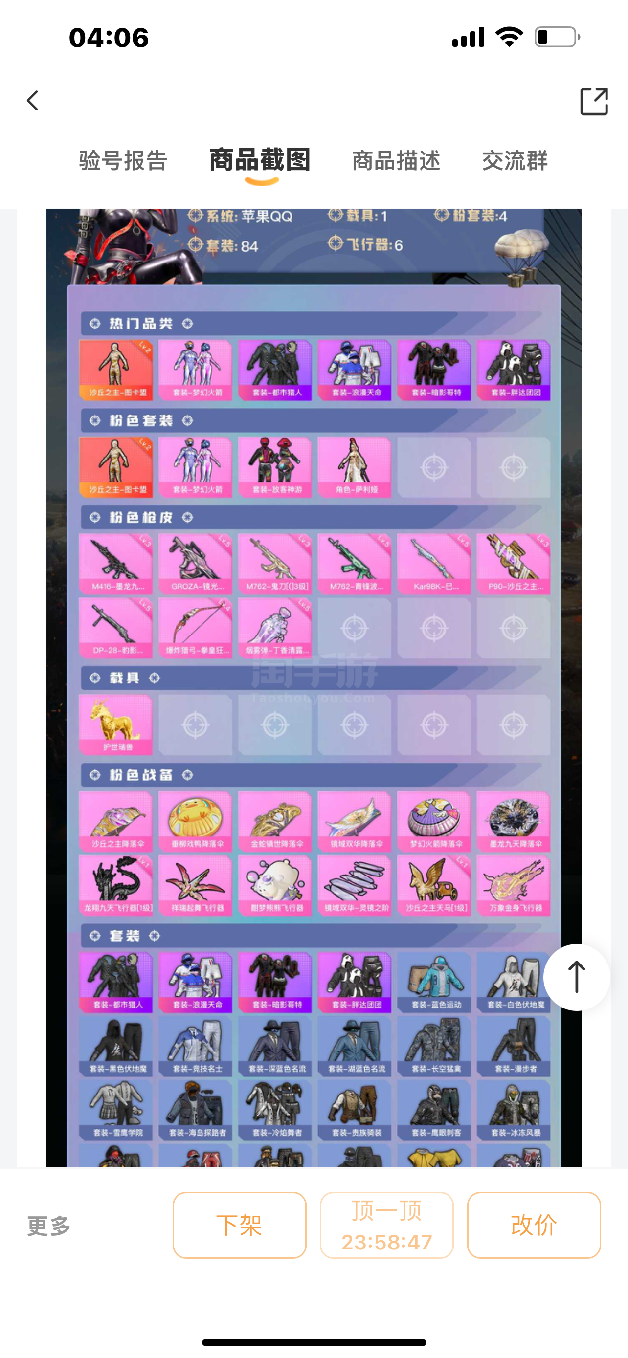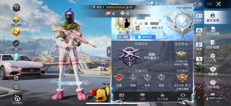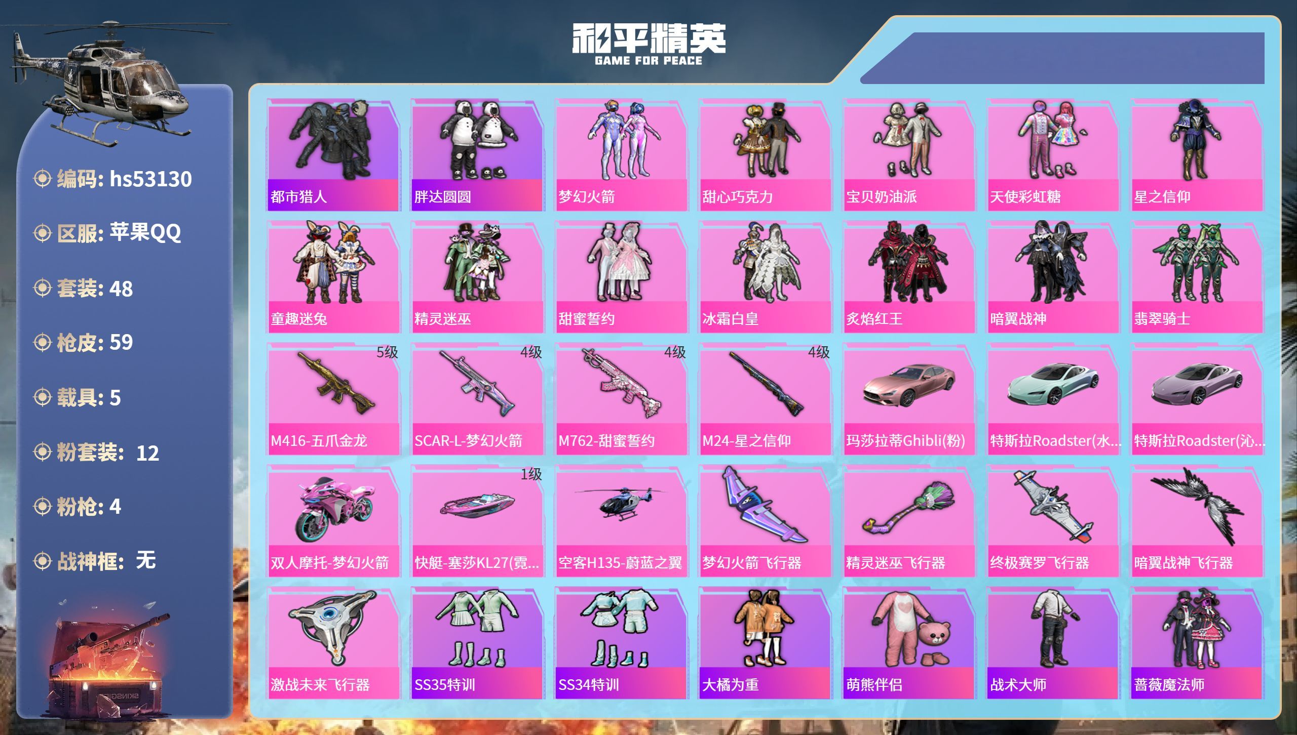 hs53130 苹果手Q-0王牌印记-12粉装-4特效枪-5载具-38868热力值-48套装-59枪