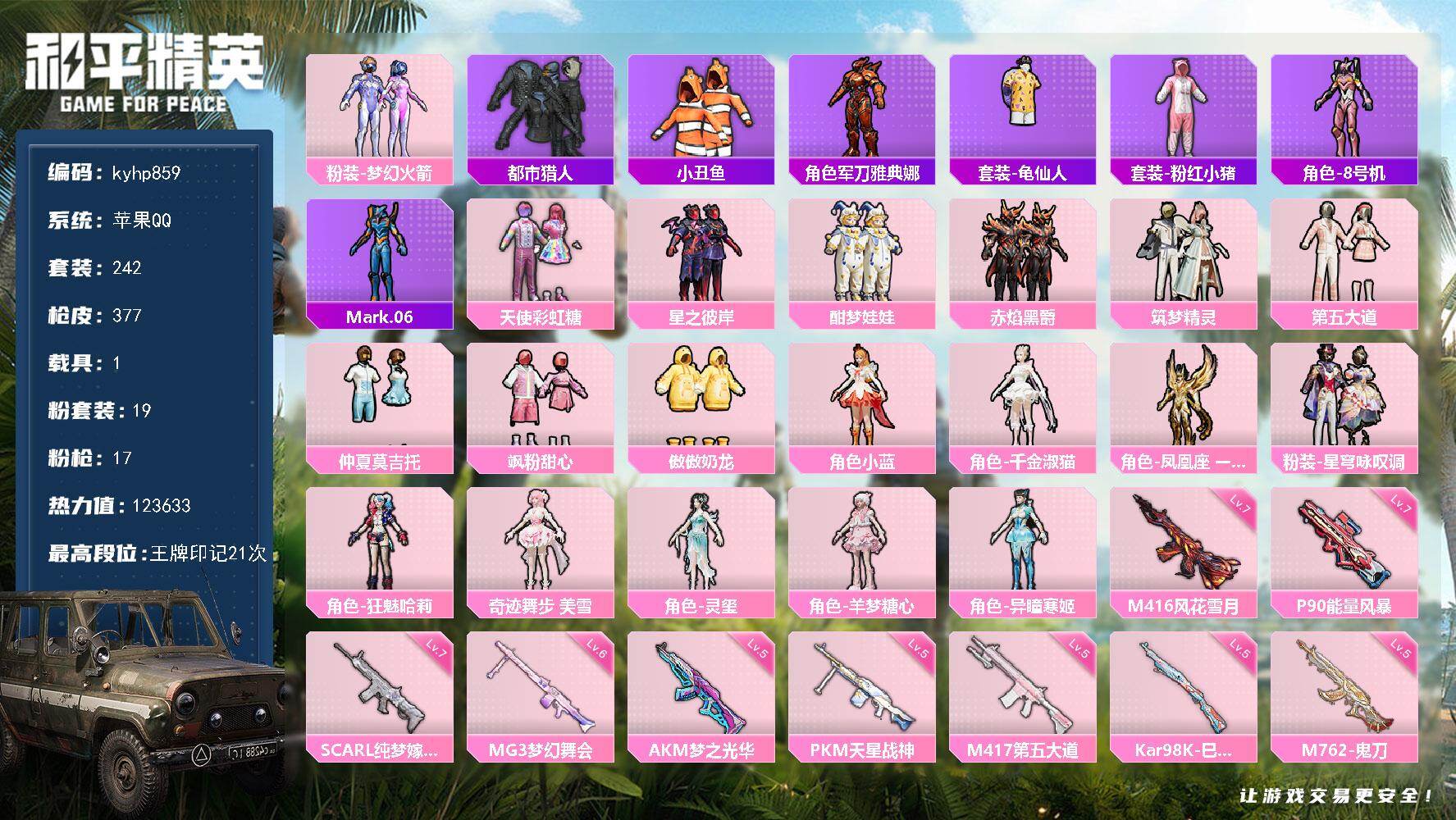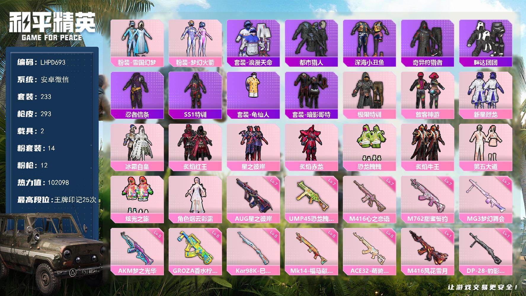 1神装-2粉装-10特效枪-1载具-7粉色飞行器-31869热力值-1王牌印记-60套装-93枪皮