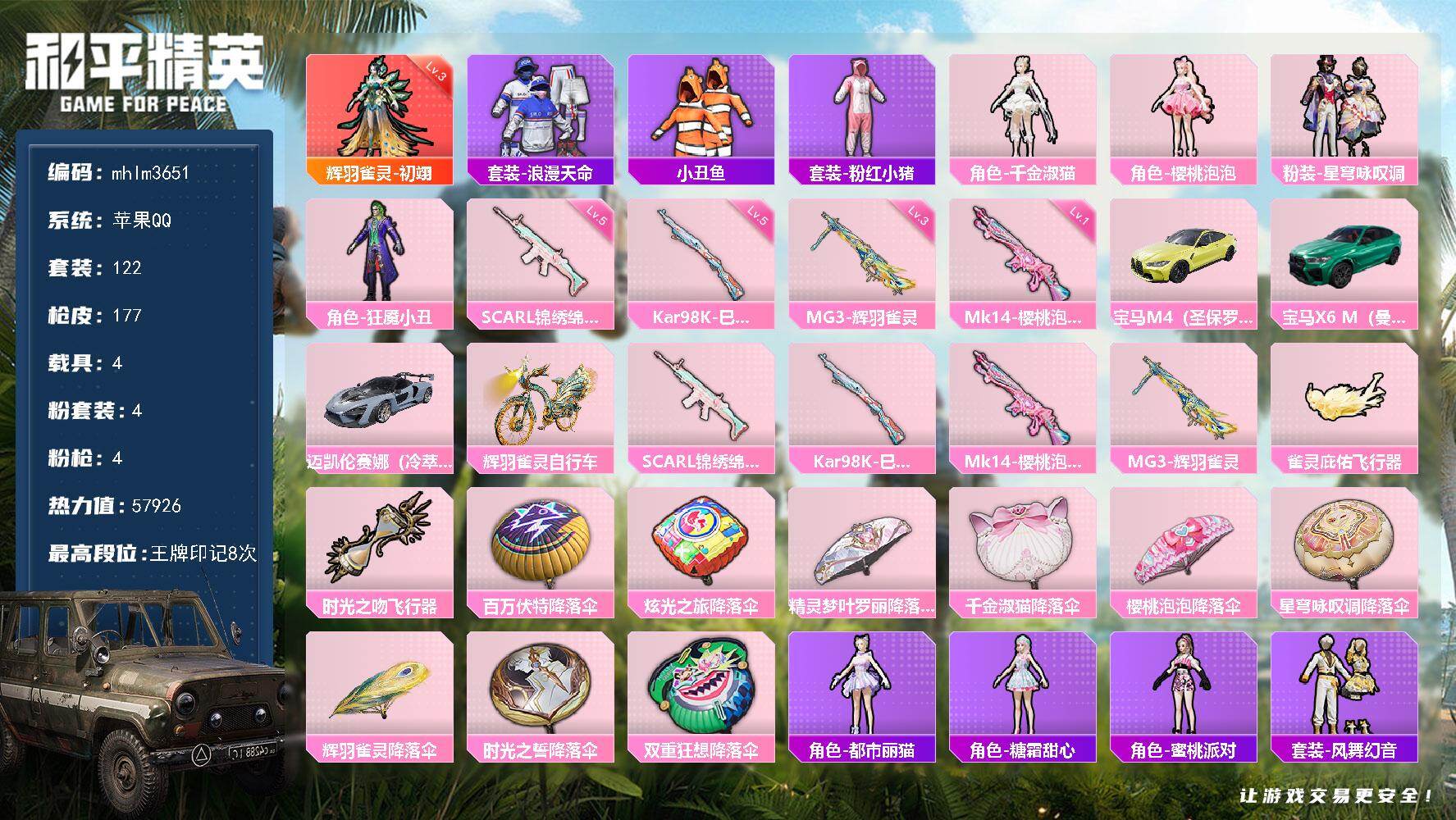 1神装-4粉装-4特效枪-4载具-2粉色飞行器-57926热力值-8王牌印记-122套装-177枪皮