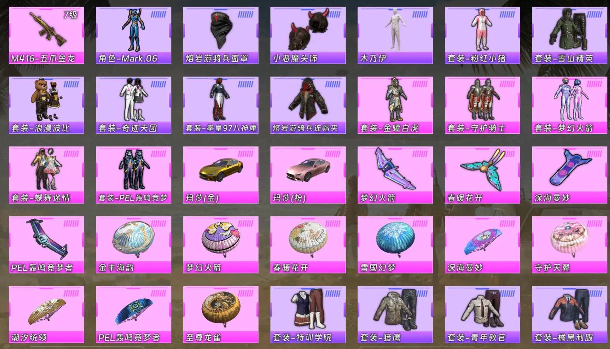24粉装-7特效枪-1载具-1粉色飞行器-70000热力值-8王牌印记-161套装-189枪皮