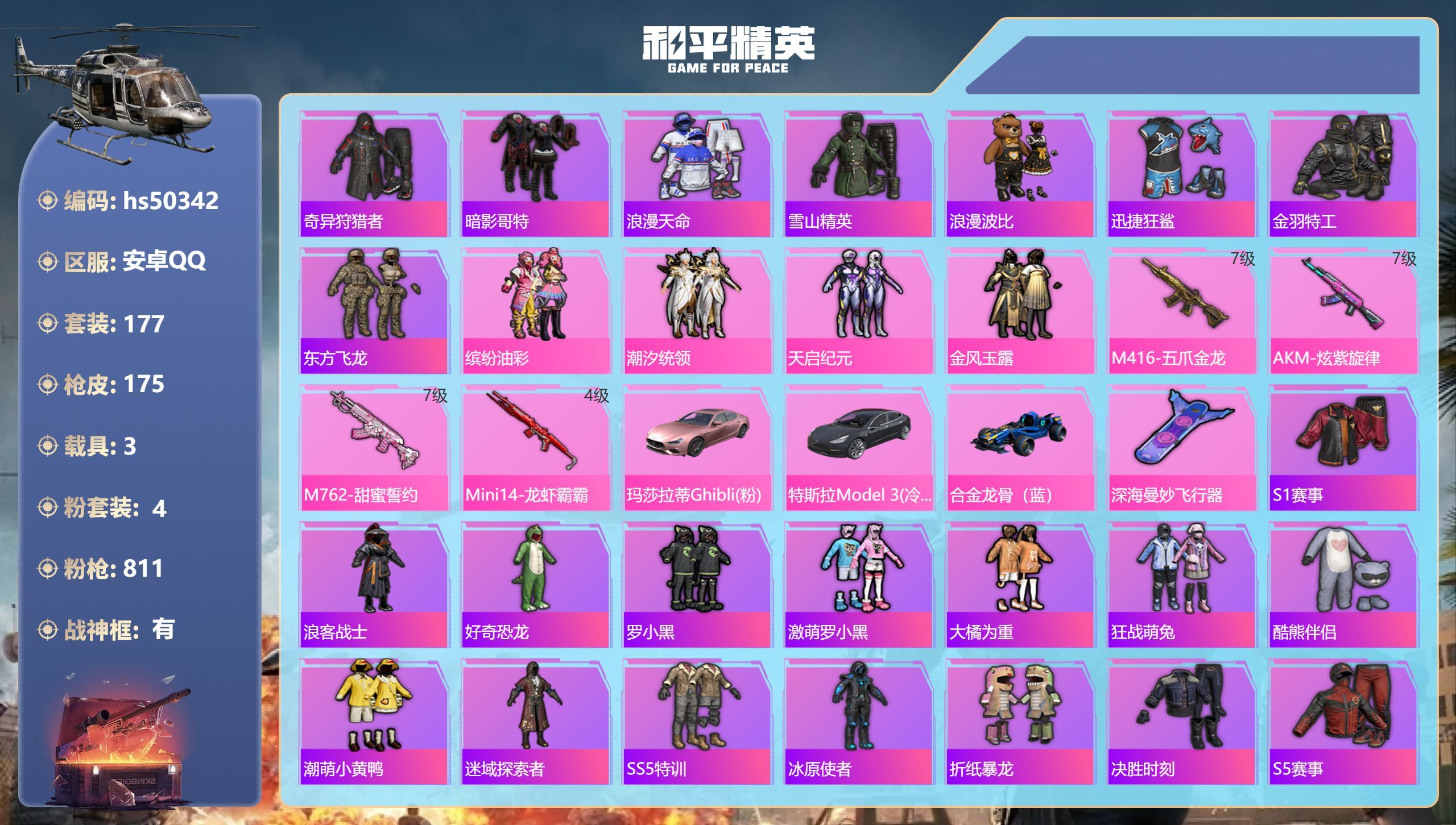 a4177/安卓v/-12王牌印记-12粉装-10特效枪-1载具-71112热力值-177套装-2