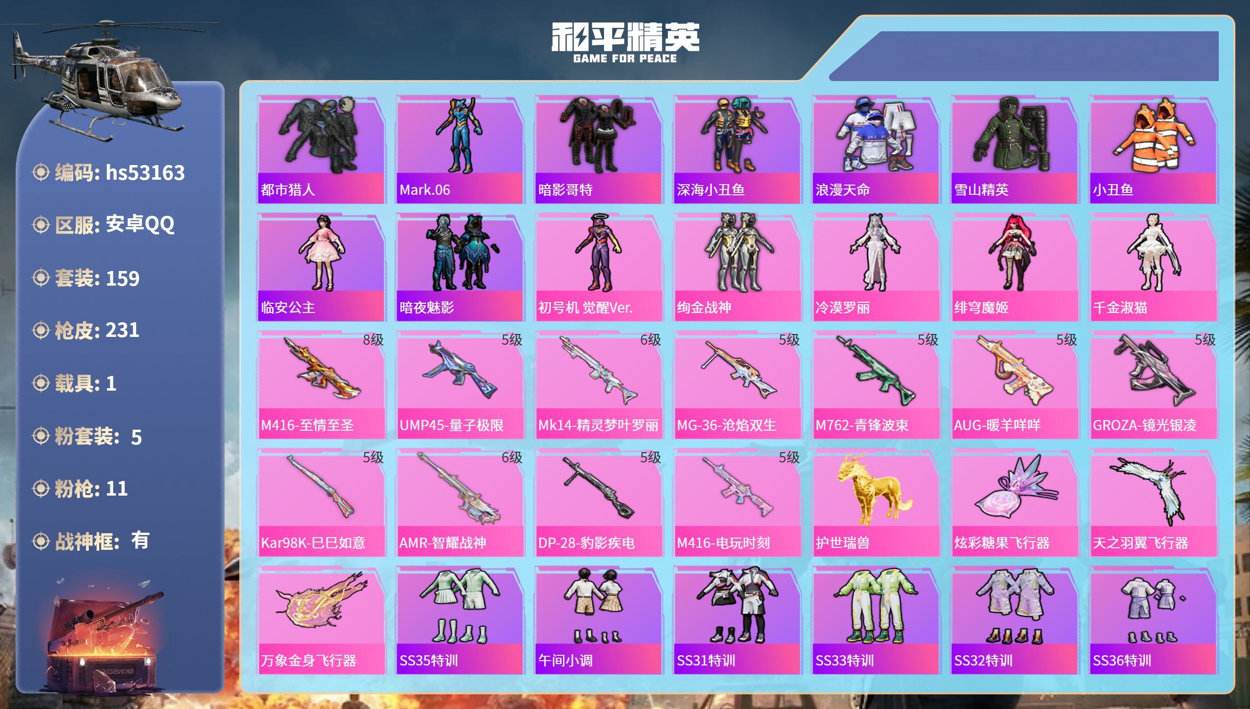 hs43152 安卓微-17王牌印记-14粉装-8特效枪-2载具-118148热力值-264套装-