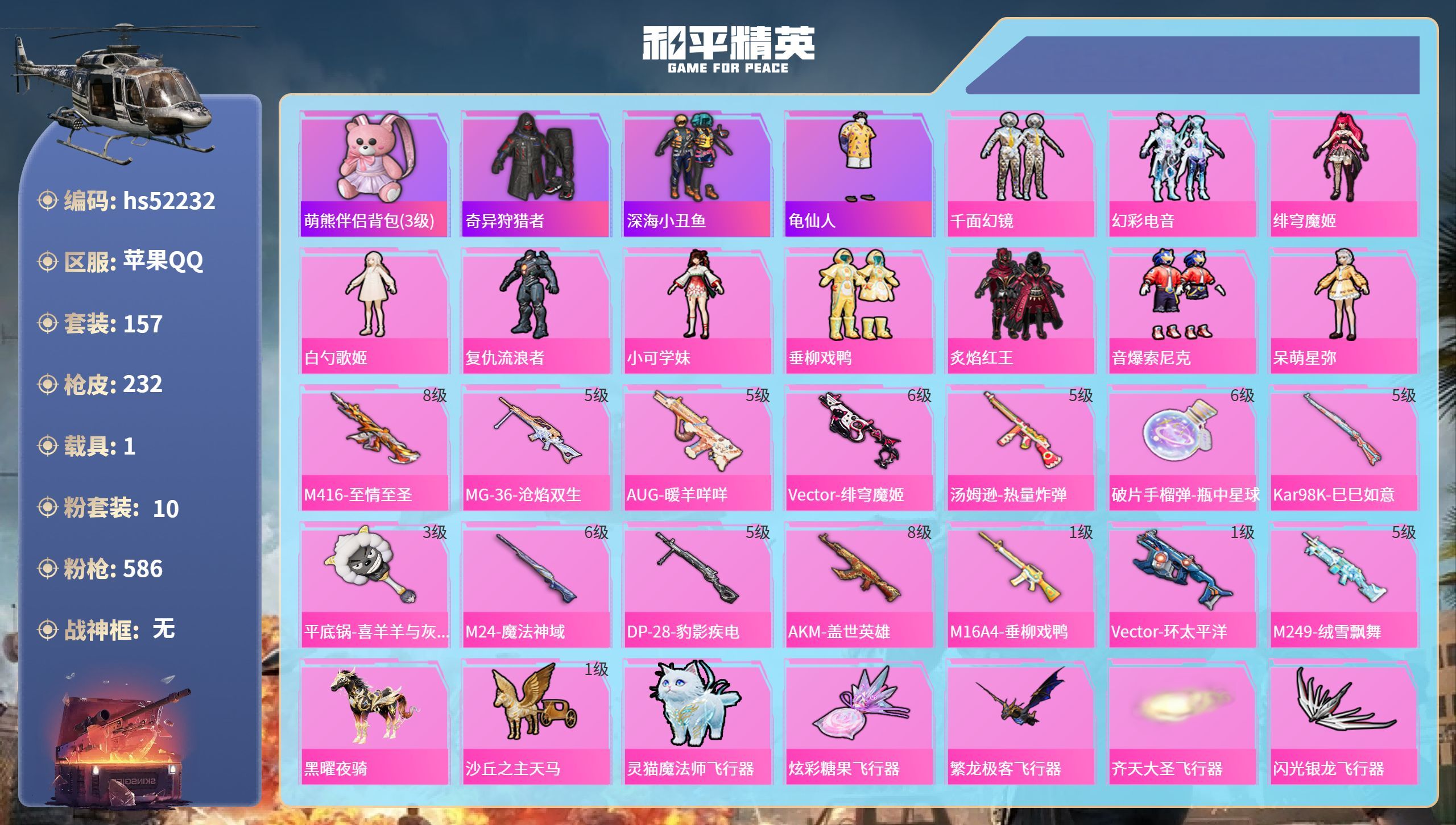 hs49071 苹果手Q-22王牌印记-10粉装-4特效枪-6载具-105367热力值-257套装-