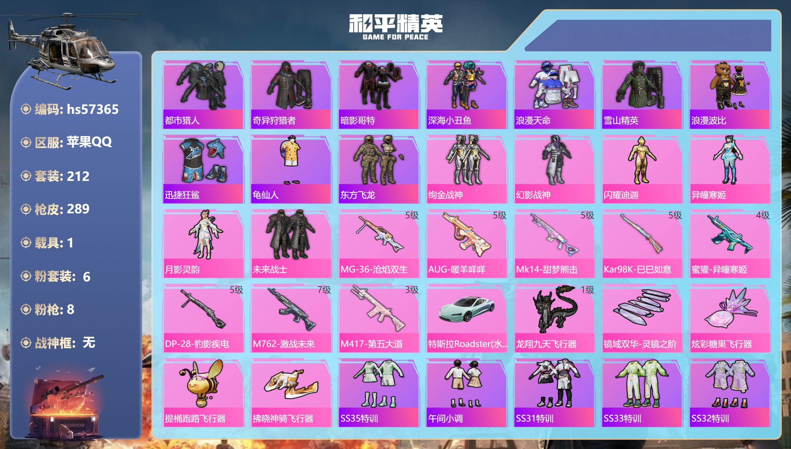 hs57365 苹果手Q-21王牌印记-6粉装-8特效枪-1载具-87706热力值-212套装-28