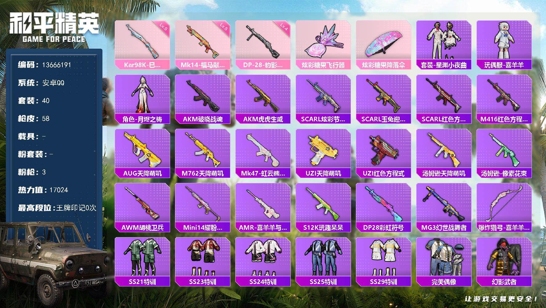 715-【4特效枪 可秒换绑不用等】 安卓Q区-4527热力值-8套装-23枪皮