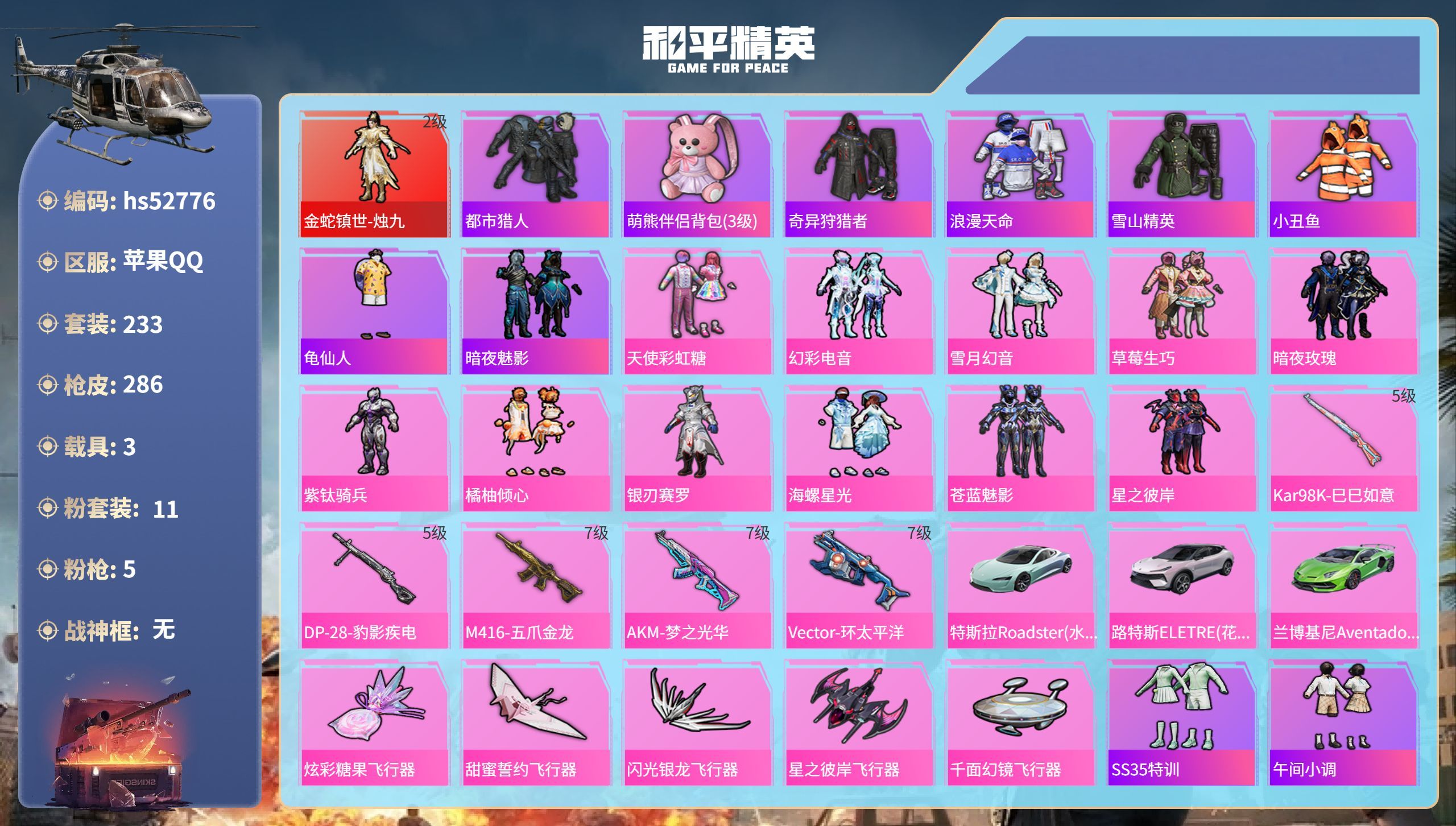 hs43002 苹果微-14王牌印记-有战神框-4粉装-0特效枪-2载具-66529热力值-197