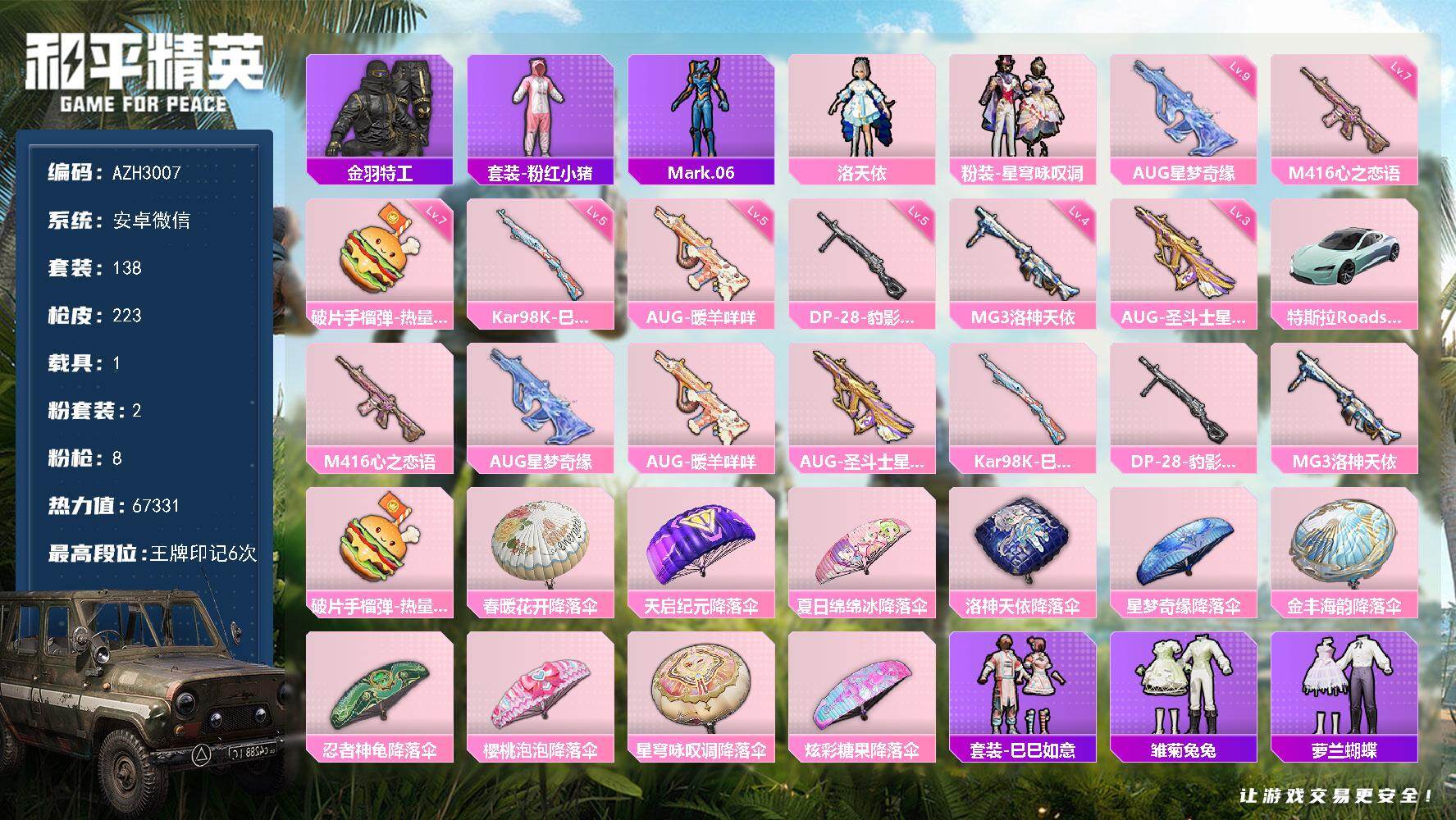 hs59338 安卓手Q-13王牌印记-15粉装-11特效枪-3载具-91990热力值-189套装-