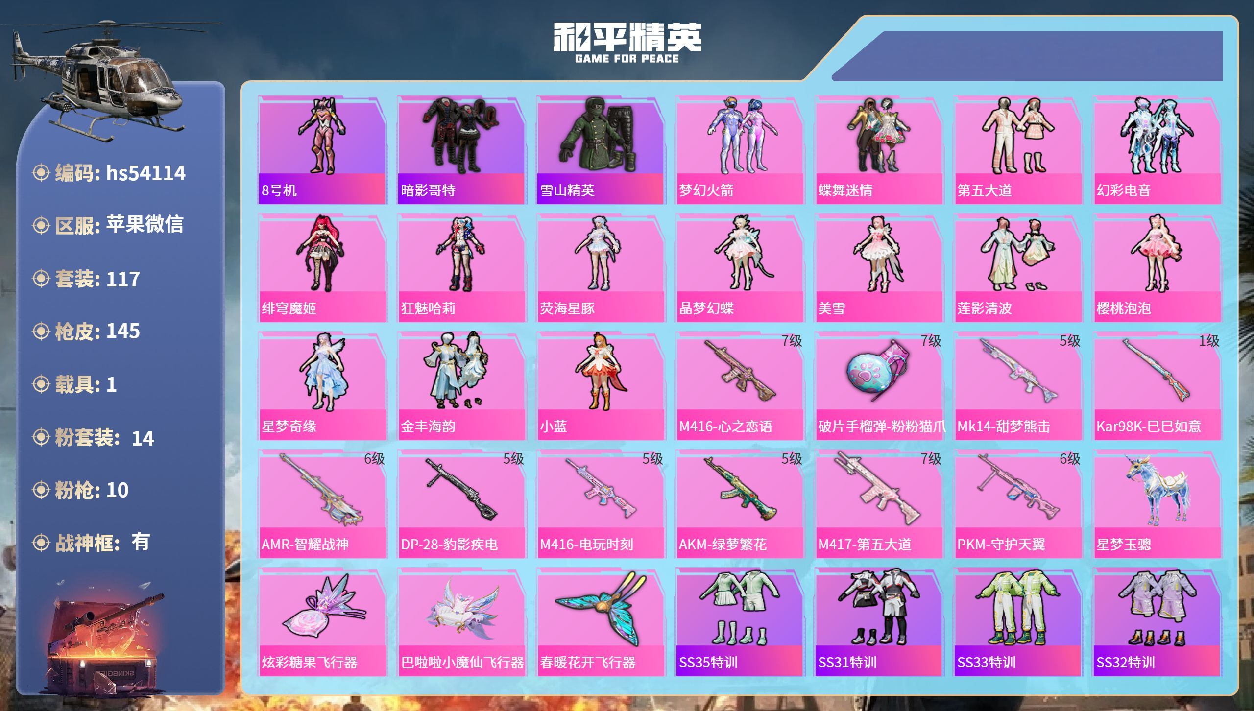 hs54114 苹果v-13王牌印记-有战神框-14粉装-10特效枪-1载具-57691热力值-1