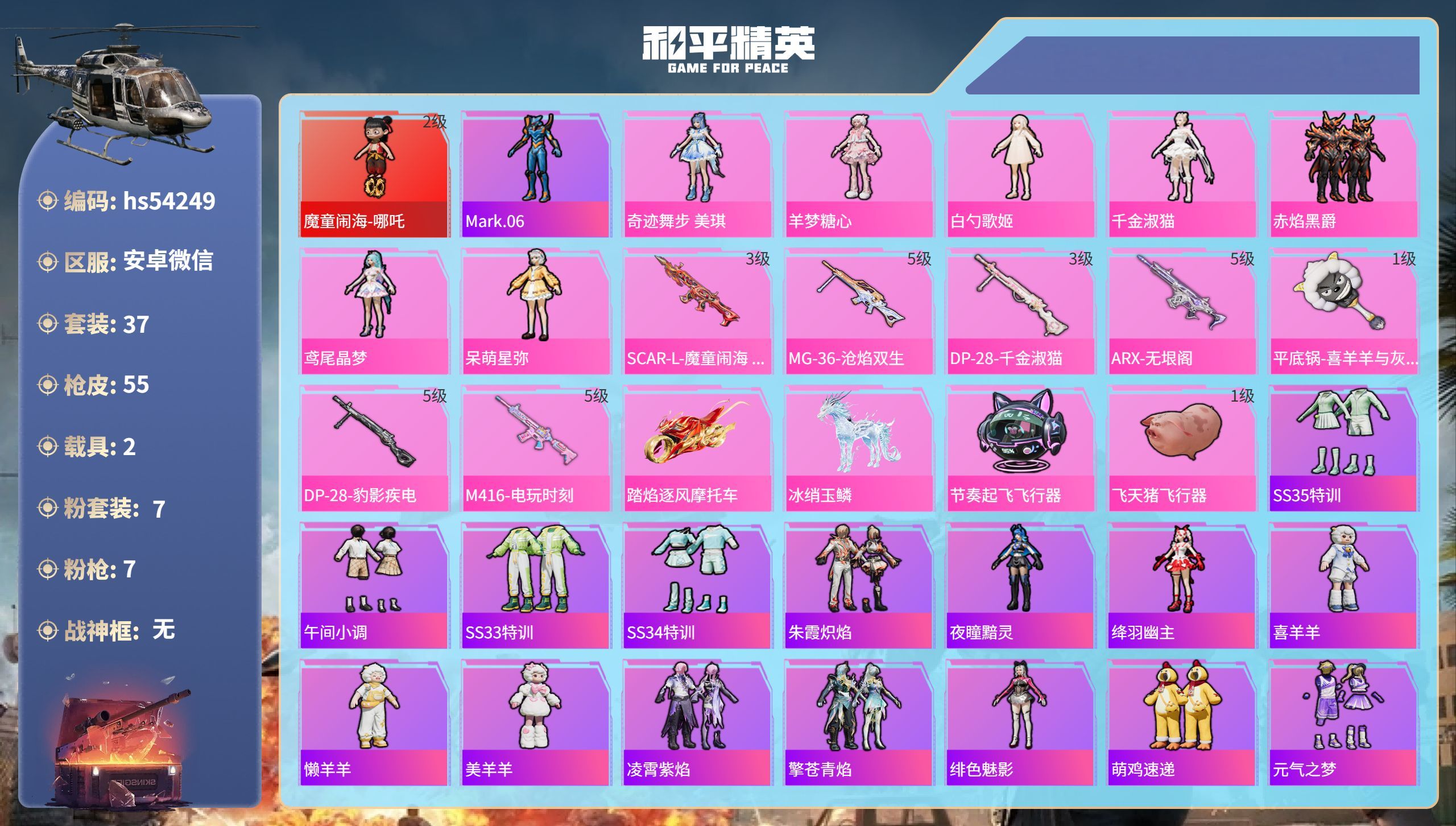 hs54249 安卓v-2王牌印记-1红装-7粉装-7特效枪-2载具-24179热力值-37套装-