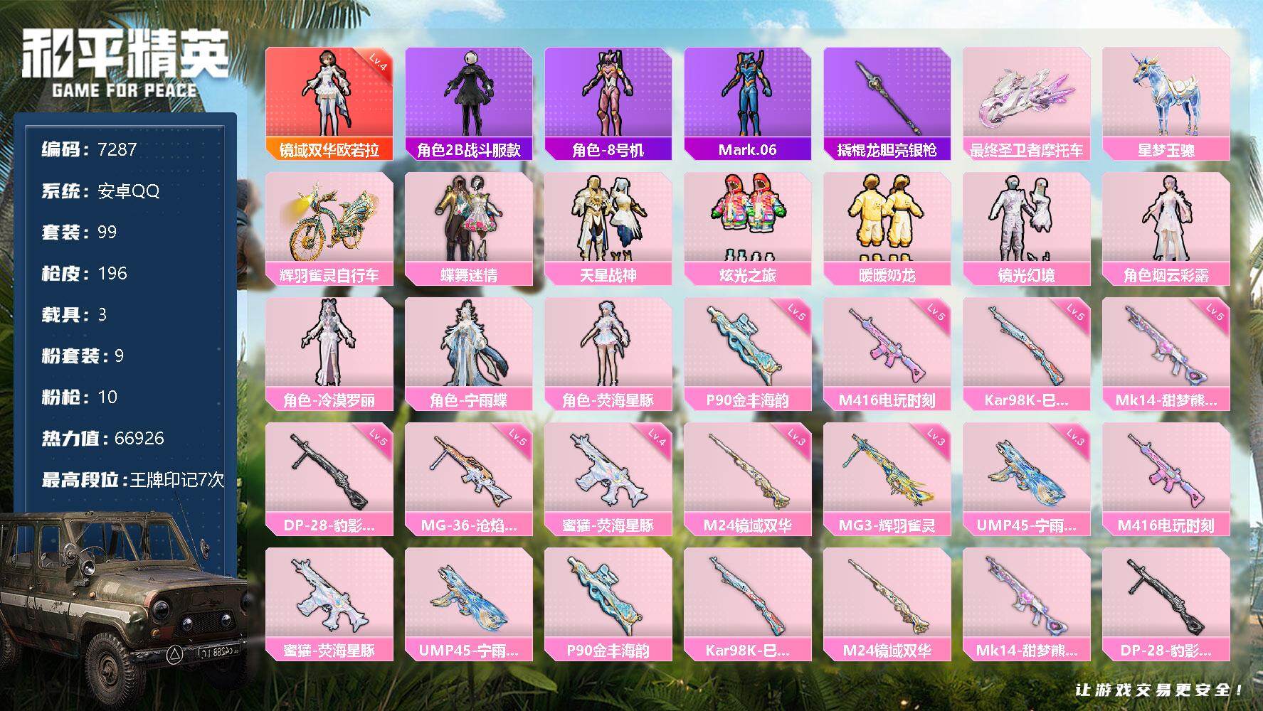 安卓 手Q-20粉装-8特效枪-4载具-4粉色飞行器-60718热力值-7王牌
