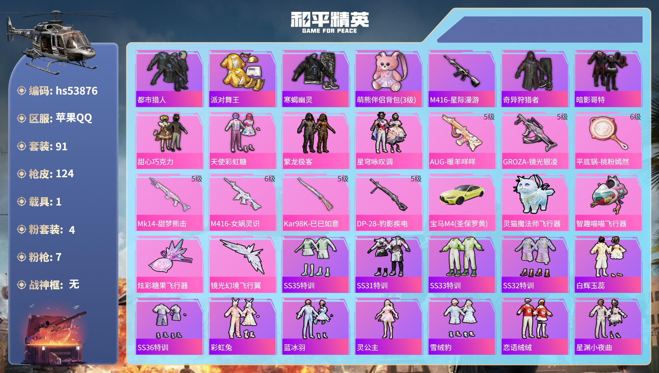 hs53876 苹果手Q-6王牌印记-4粉装-7特效枪-1载具-38948热力值-91套装-124枪