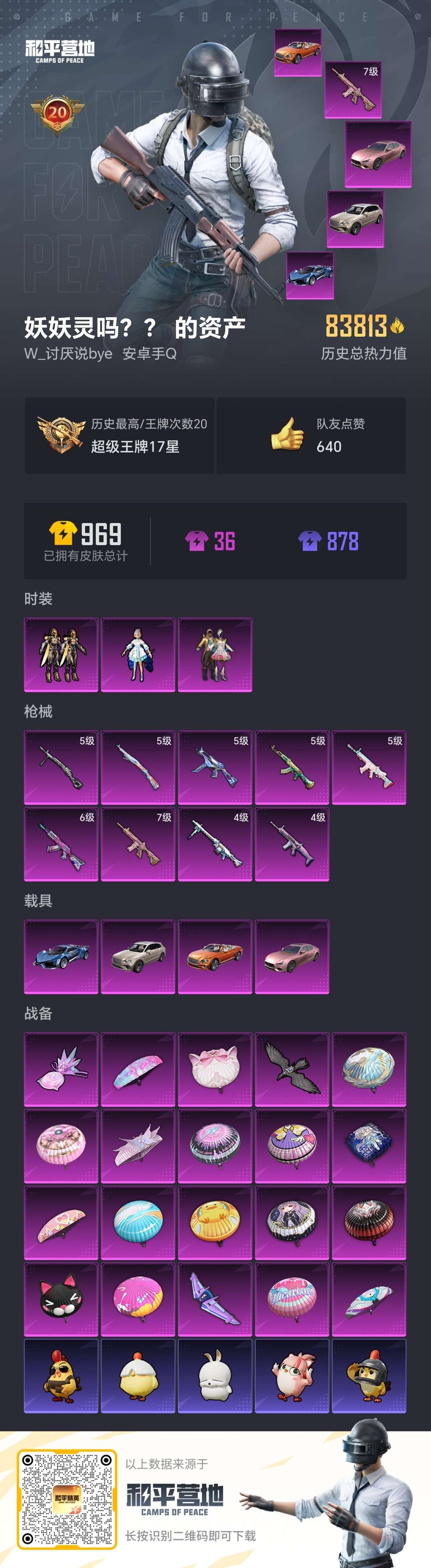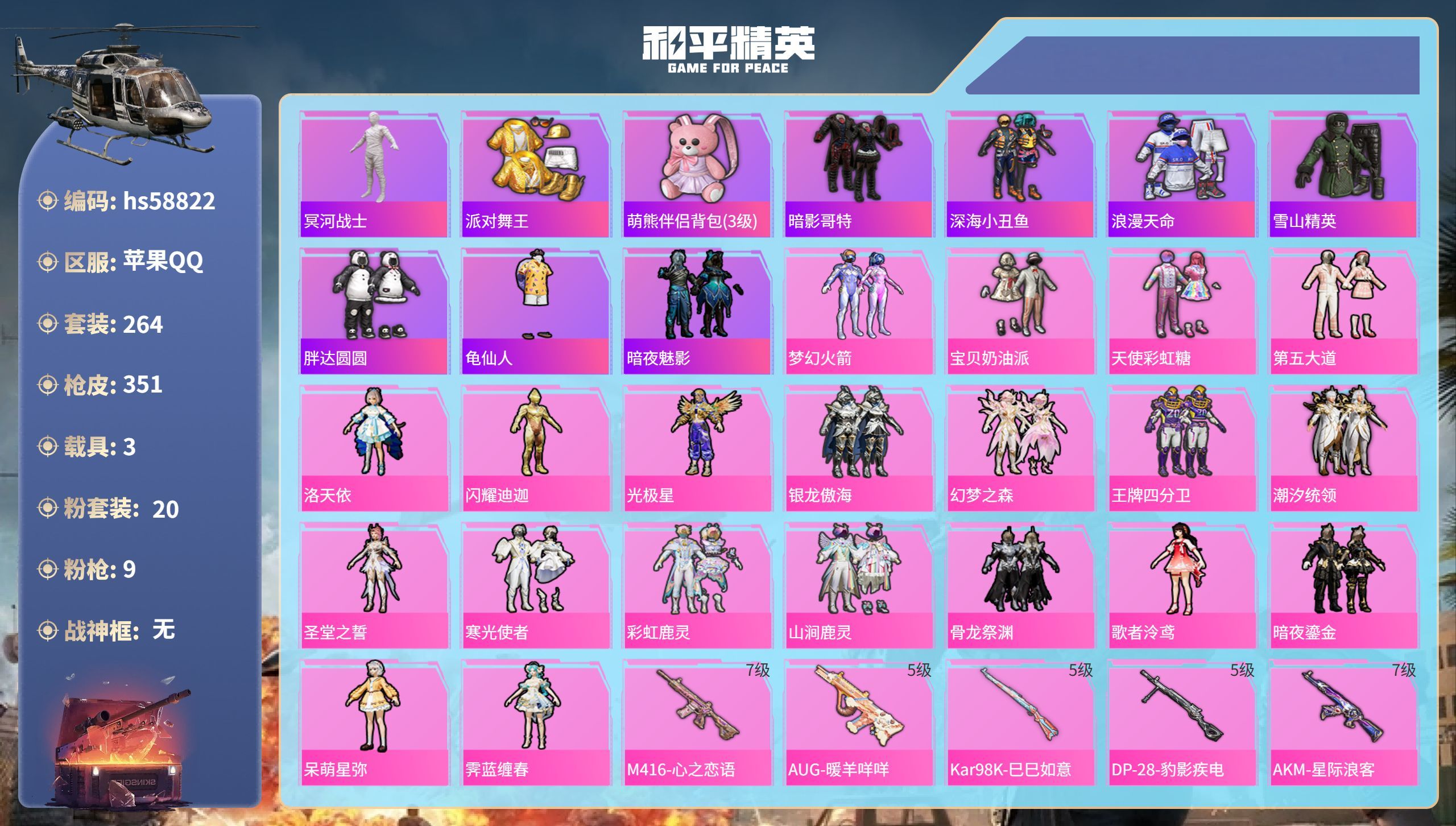 hs58822 苹果手Q-18王牌印记-20粉装-9特效枪-3载具-121677热力值-264套装-