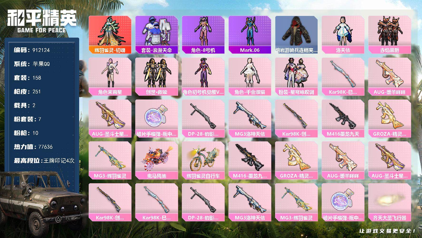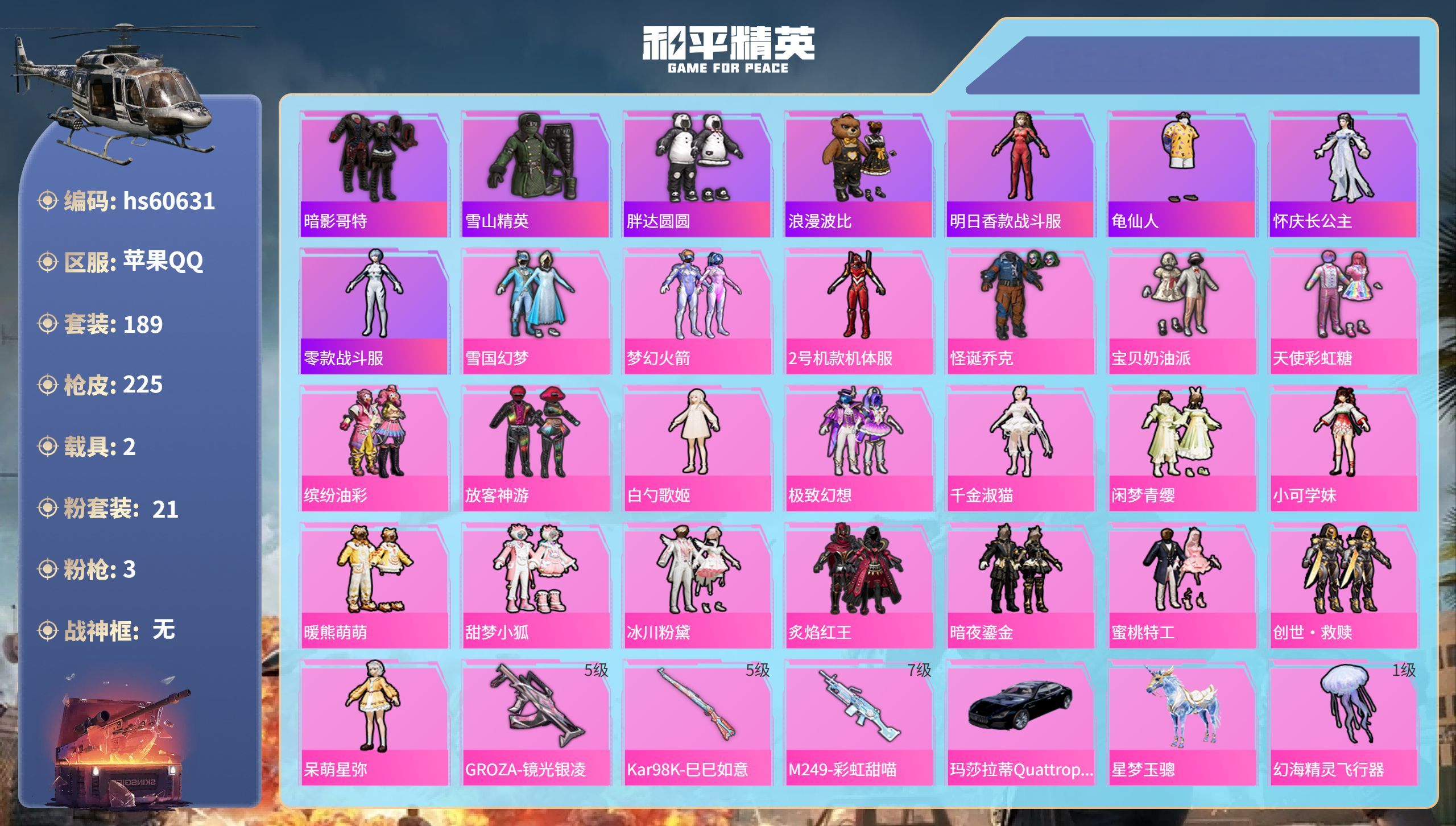 hs60631 苹果手Q-14王牌印记-21粉装-3特效枪-2载具-77725热力值-189套装-2