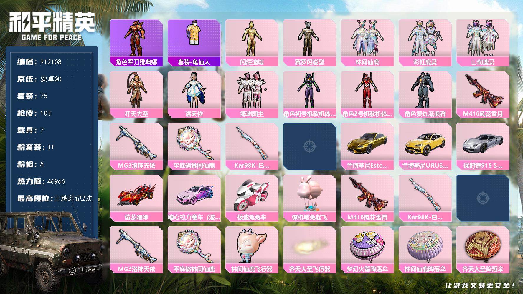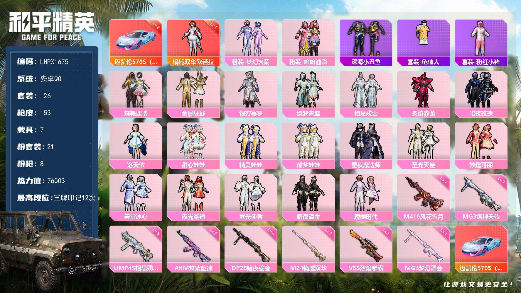 hs49932 安卓手Q-12王牌印记-14粉装-13特效枪-2载具-77469热力值-160套装-