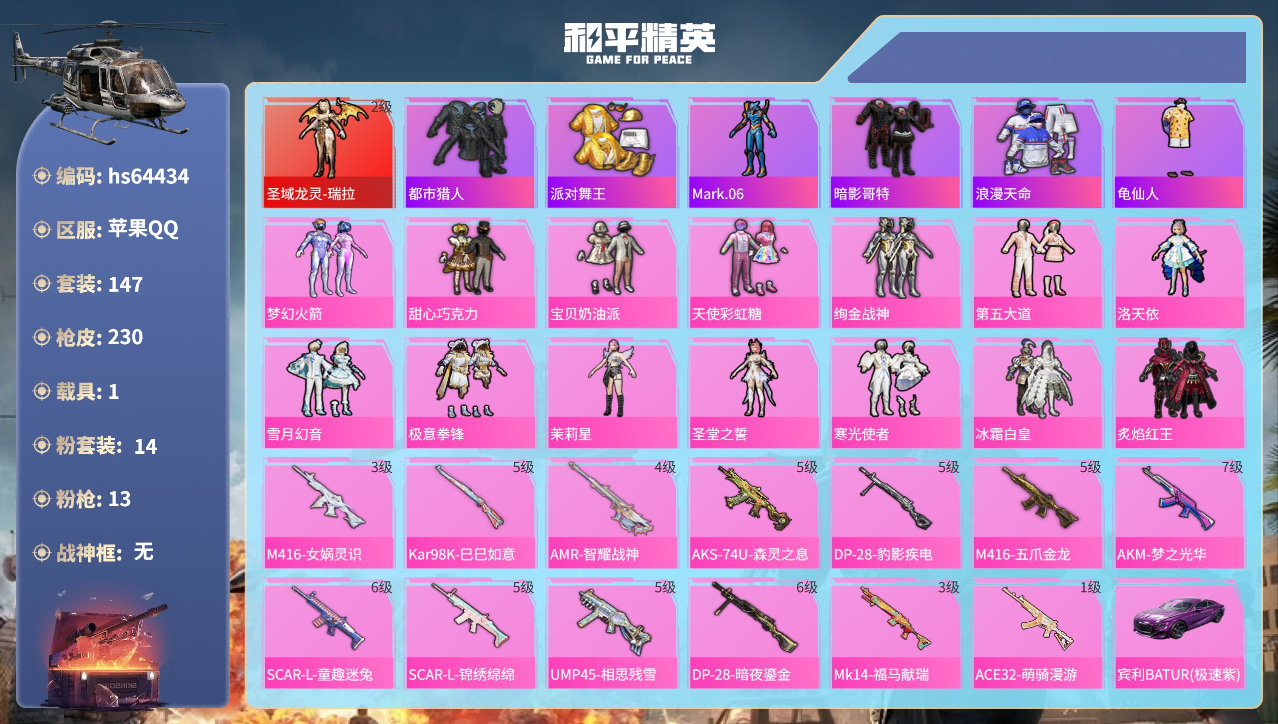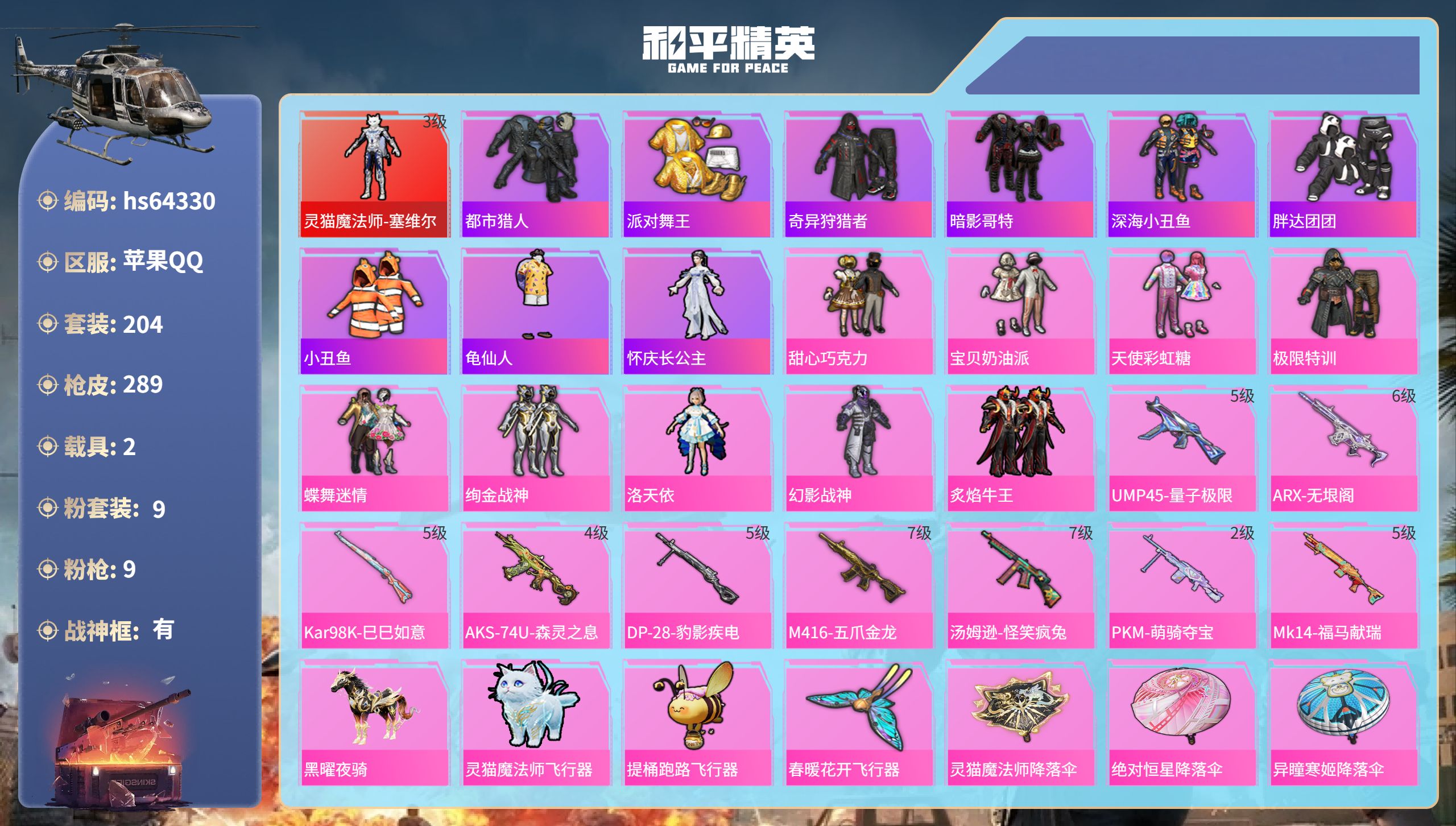 苹果 微信-3神装-6粉装-8特效枪-2载具-9粉色飞行器-45425热力值-