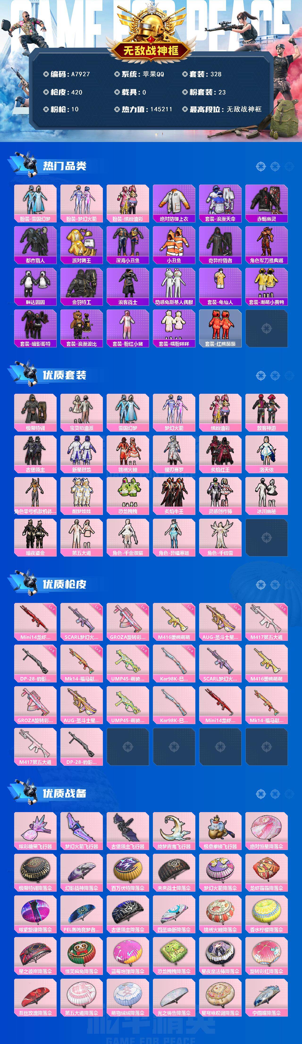 连体号 总资产24.7m 蚀金玫瑰 黑天际线 北极星 粉色m7砖皮优品c 特斯拉捆绑包 捞点薯条捆绑包 电锯惊魂捆绑包 连体苹果和平 160套装240枪皮7粉装6特效1载具 觉醒初号机 新星烈龙 9级至情至圣