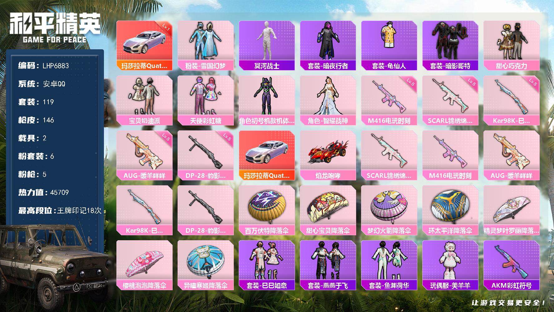 hs43439 安卓手Q-18王牌印记-12粉装-9特效枪-2载具-143889热力值-332套装-