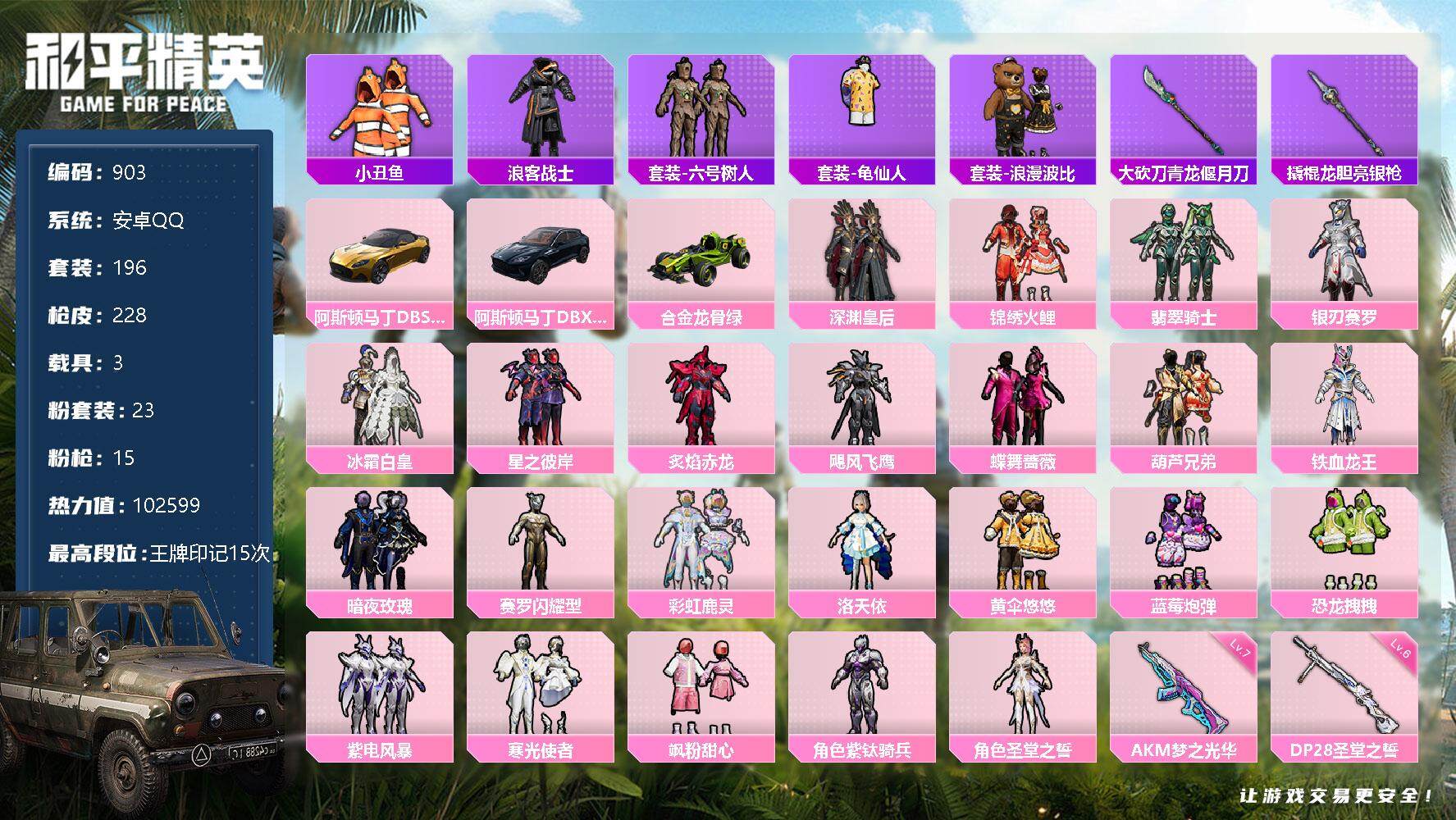 hs47892 安卓手Q-19王牌印记-14粉装-8特效枪-1载具-97256热力值-224套装-2