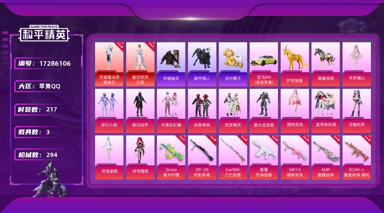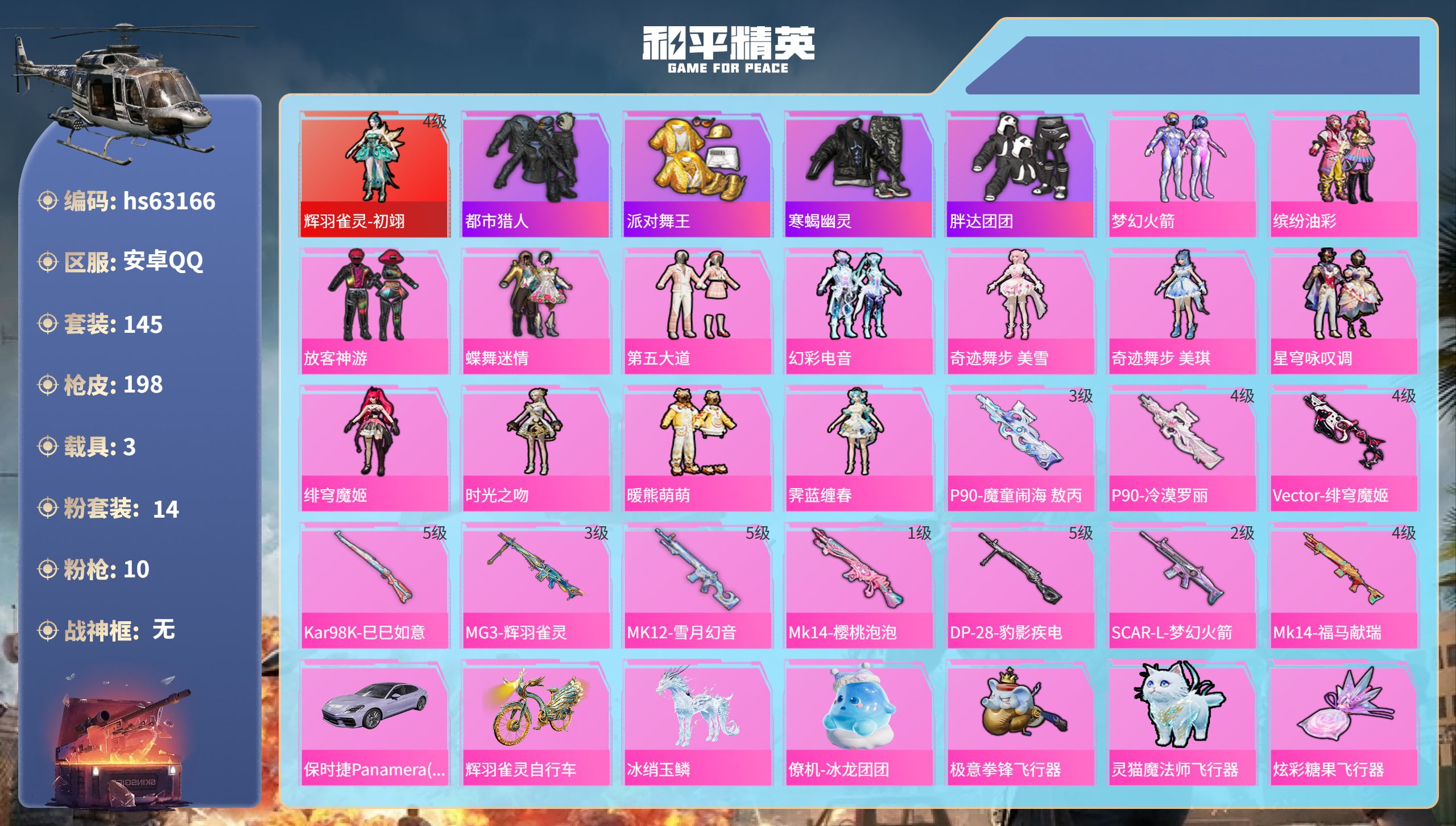 安卓 手Q-1神装-18粉装-21特效枪-3载具-16粉色飞行器-118910热