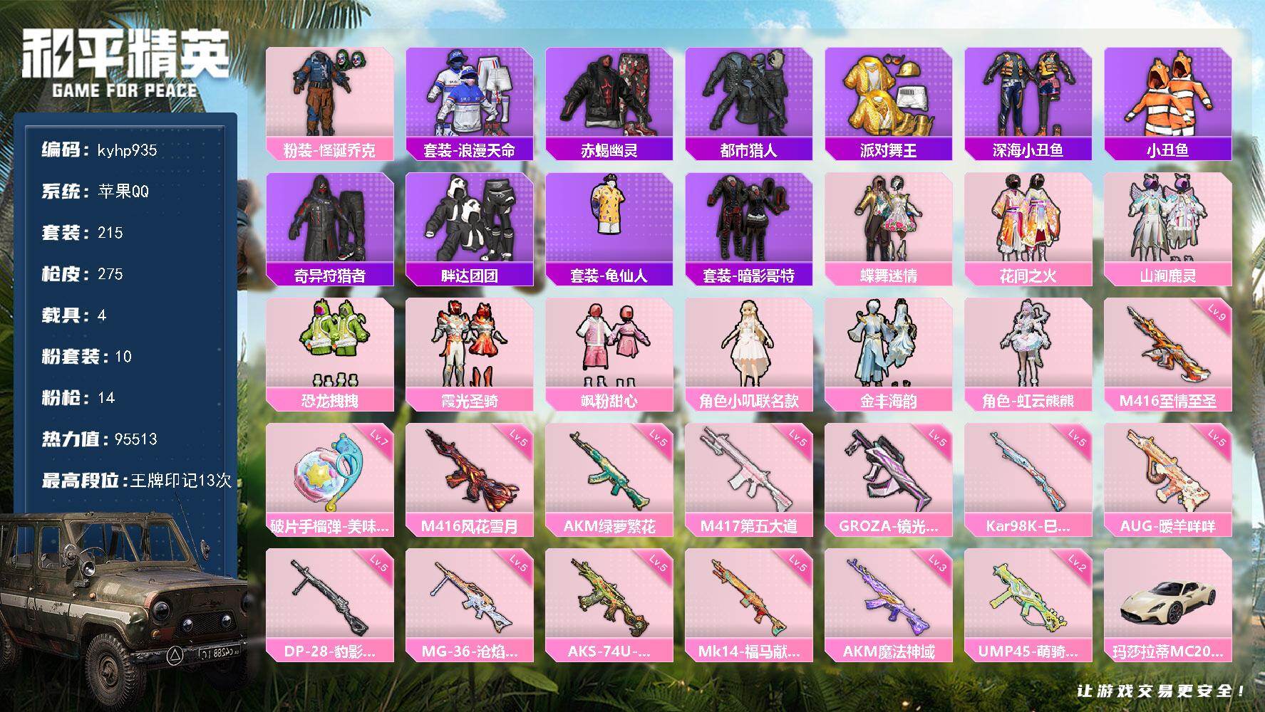 10粉装-14特效枪-4载具-5粉色飞行器-95513热力值-13王牌印记-215套装-275枪皮