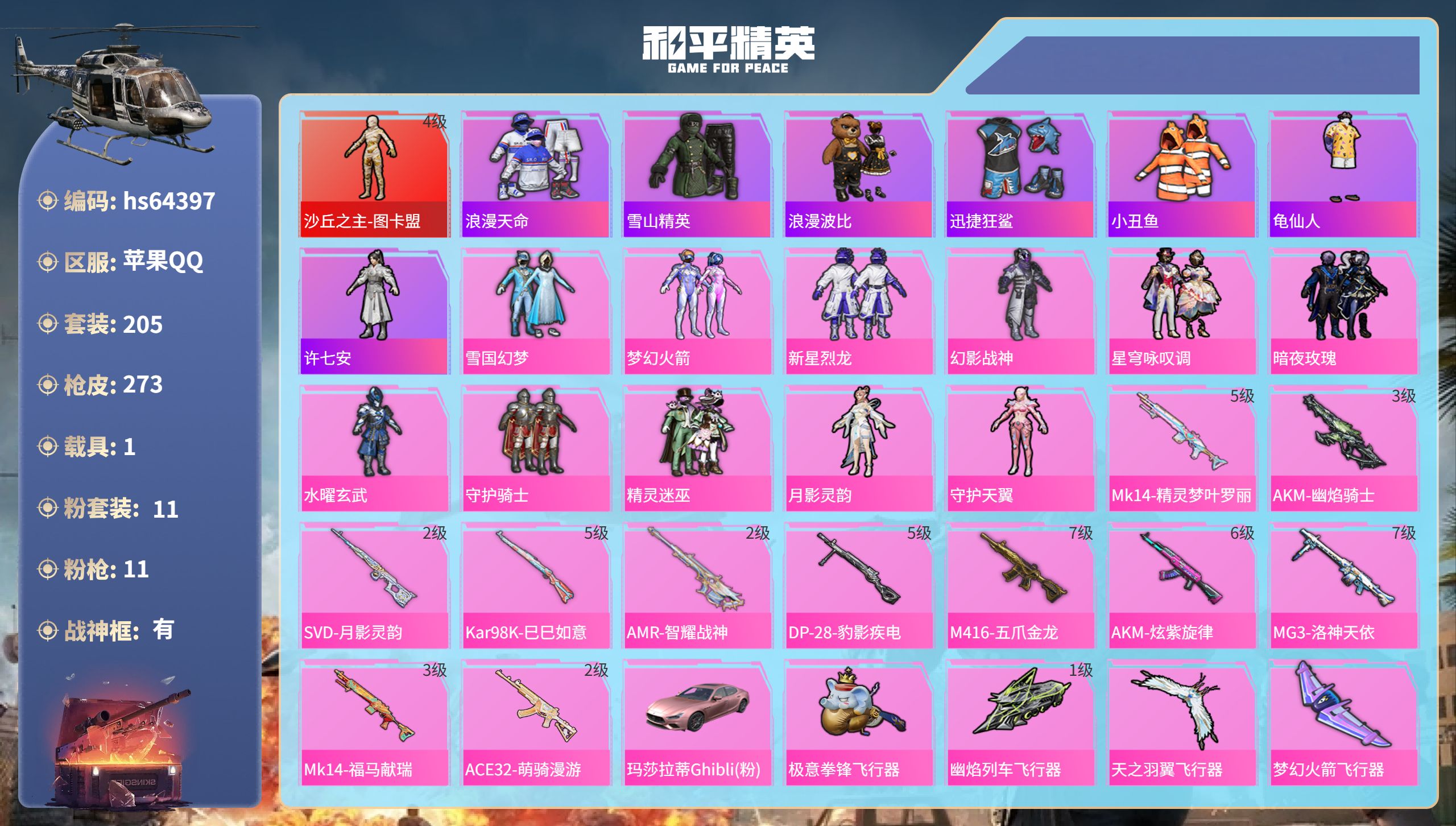 1神装-9粉装-14特效枪-2载具-7粉色飞行器-89570热力值-18王牌印记-199套装-275枪皮