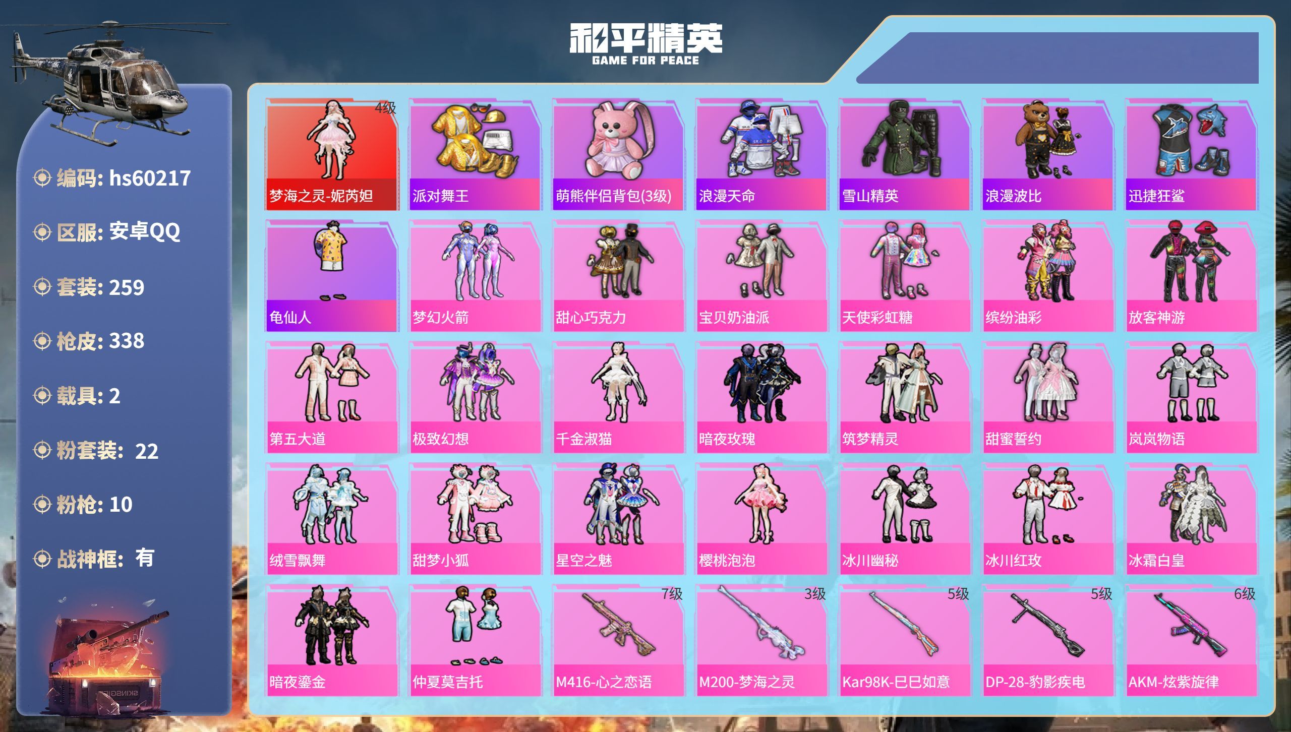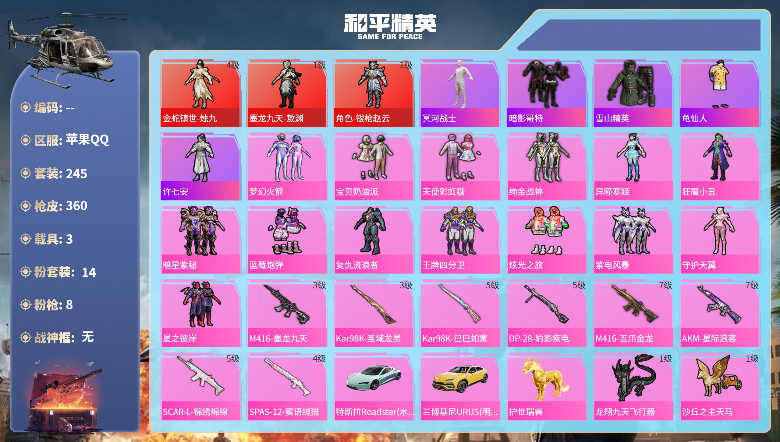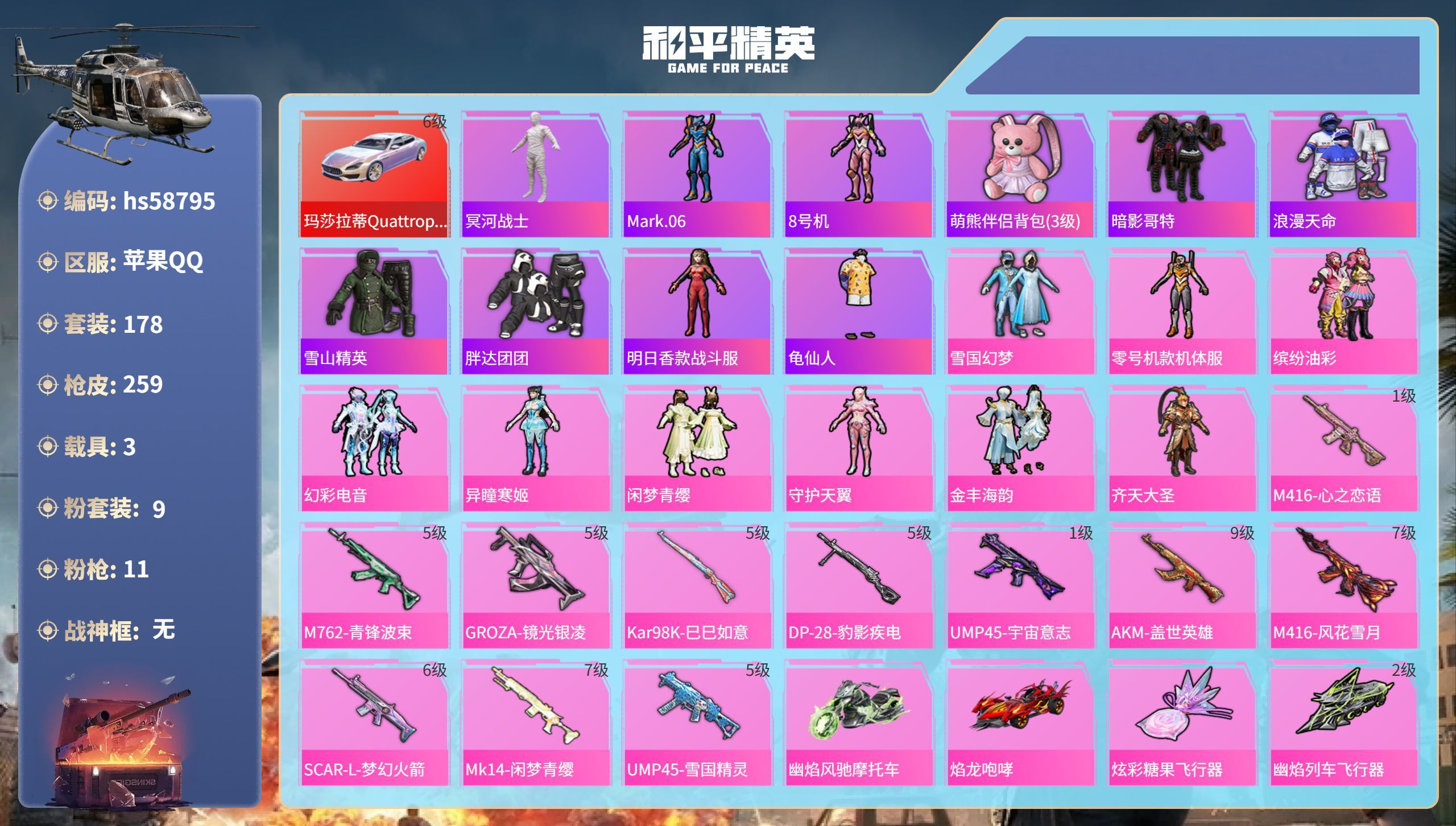 a4061/苹果QQ/-21王牌印记-有战神框-1红装-22粉装-7特效枪-3载具-114230热力