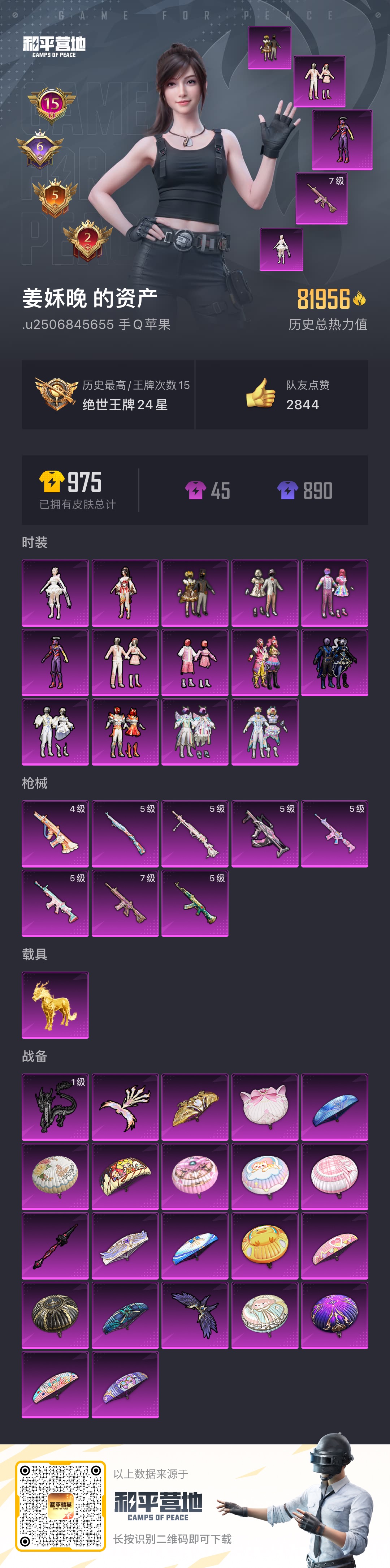 hs44482 苹果手Q-15王牌印记-有战神框-10粉装-13特效枪-0载具-82024热力值-1
