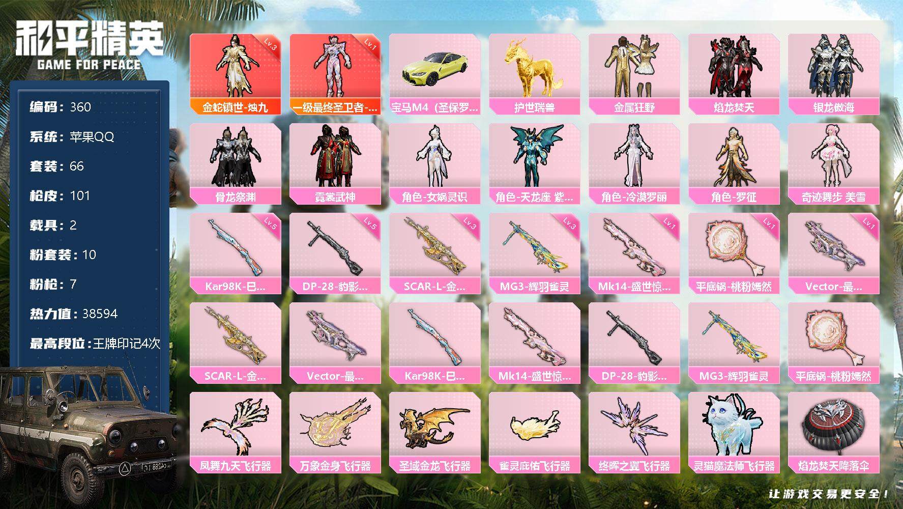 安卓QQ 1载具 6升级枪 5粉装 226枪皮 205套装 70297热力 16印记 皇冠 蓝蹦 紫螳螂 火箭少女 黑丝 都市猎人 红眼罩 粉熊背包 熊猫头盔 M4满级至情至圣 连体王者v8
