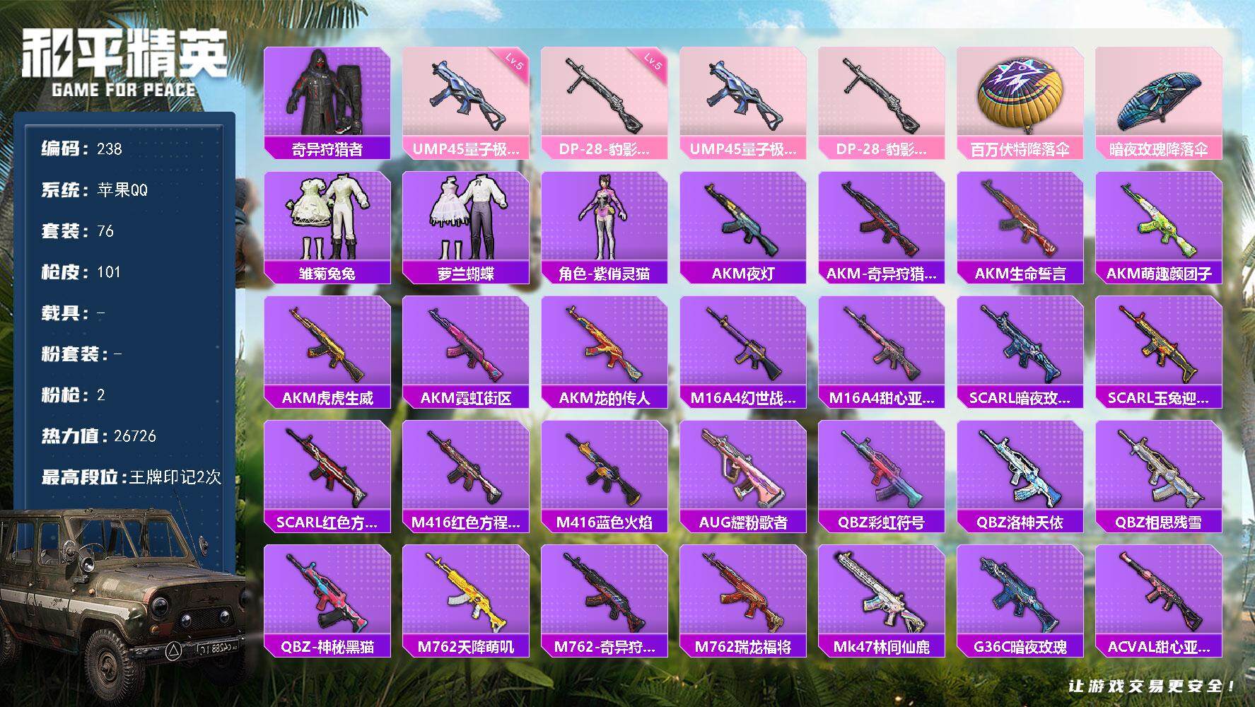 苹果 手Q-0粉装-2特效枪-0载具-0粉色飞行器-26726热力值-2王牌印
