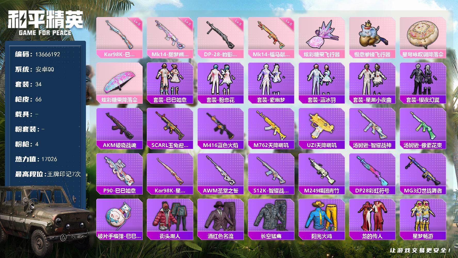 34套装/枪械4/装备78/战备41/王牌印记7/热力值17026/五级Kar