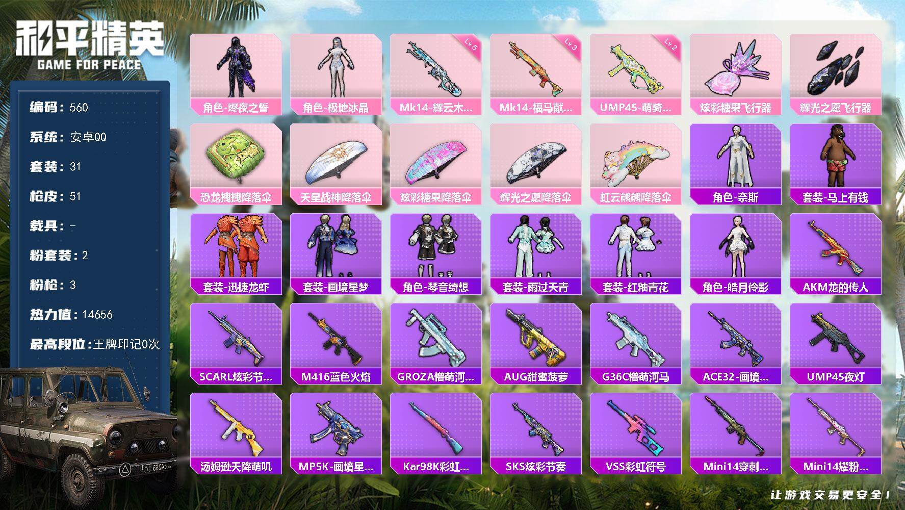 安卓 手Q-2粉装-3特效枪-0载具-2粉色飞行器-14656热力值-2王牌印