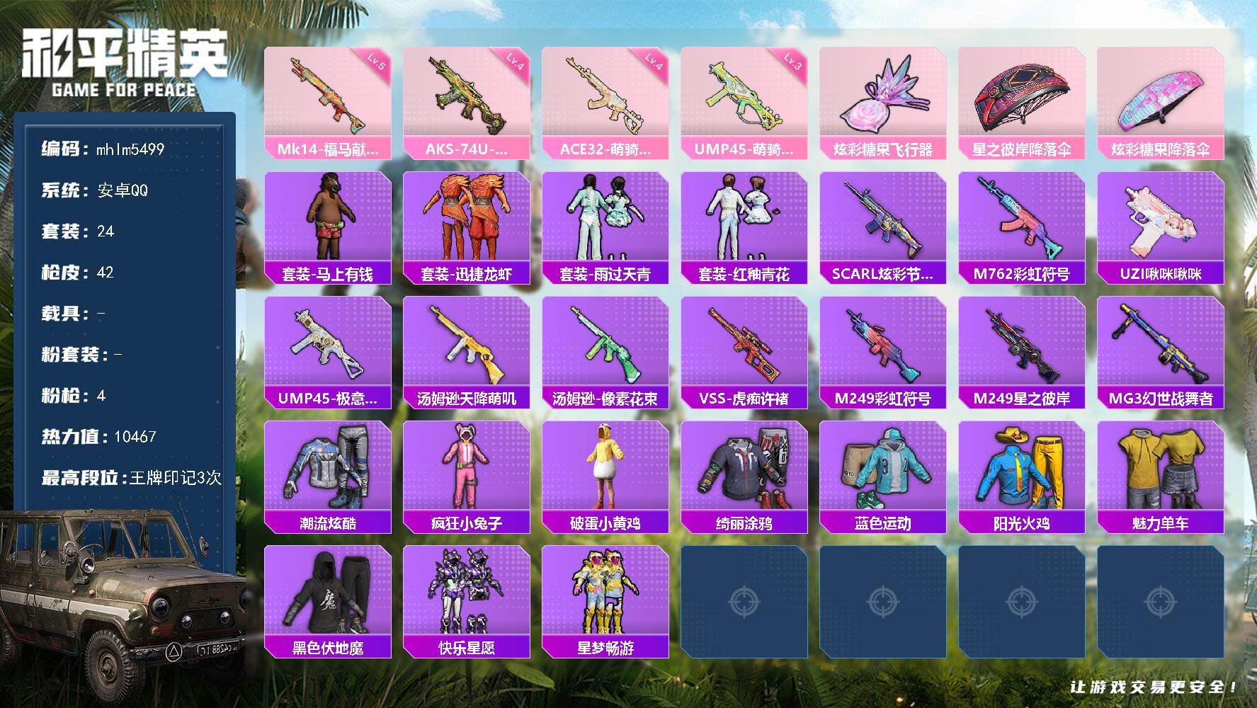 安卓 手Q-0粉装-3特效枪-0载具-1粉色飞行器-15189热力值-1王牌印