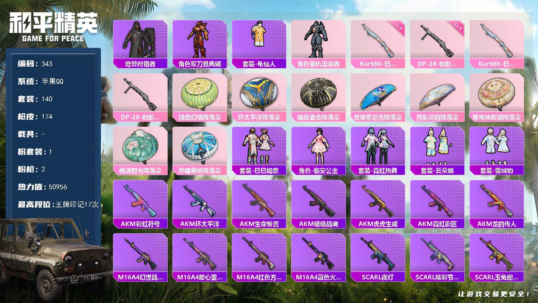 苹果 手Q-1粉装-2特效枪-0载具-1粉色飞行器-50956热力值-17王牌