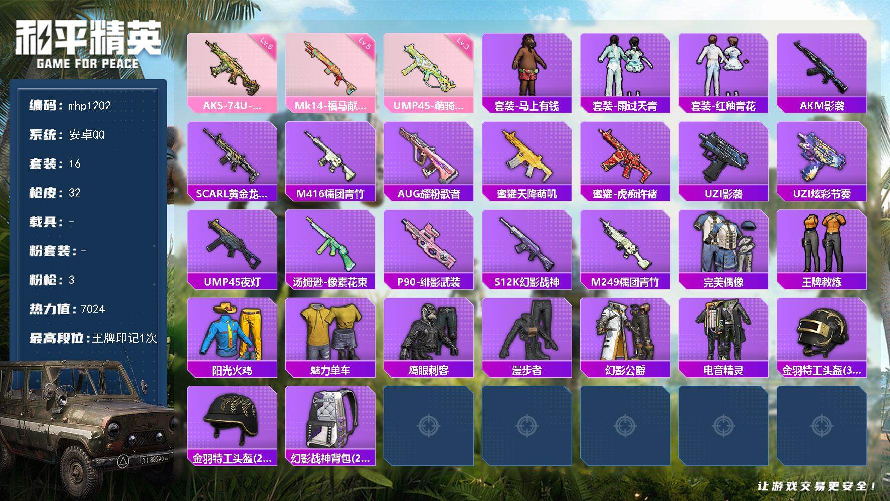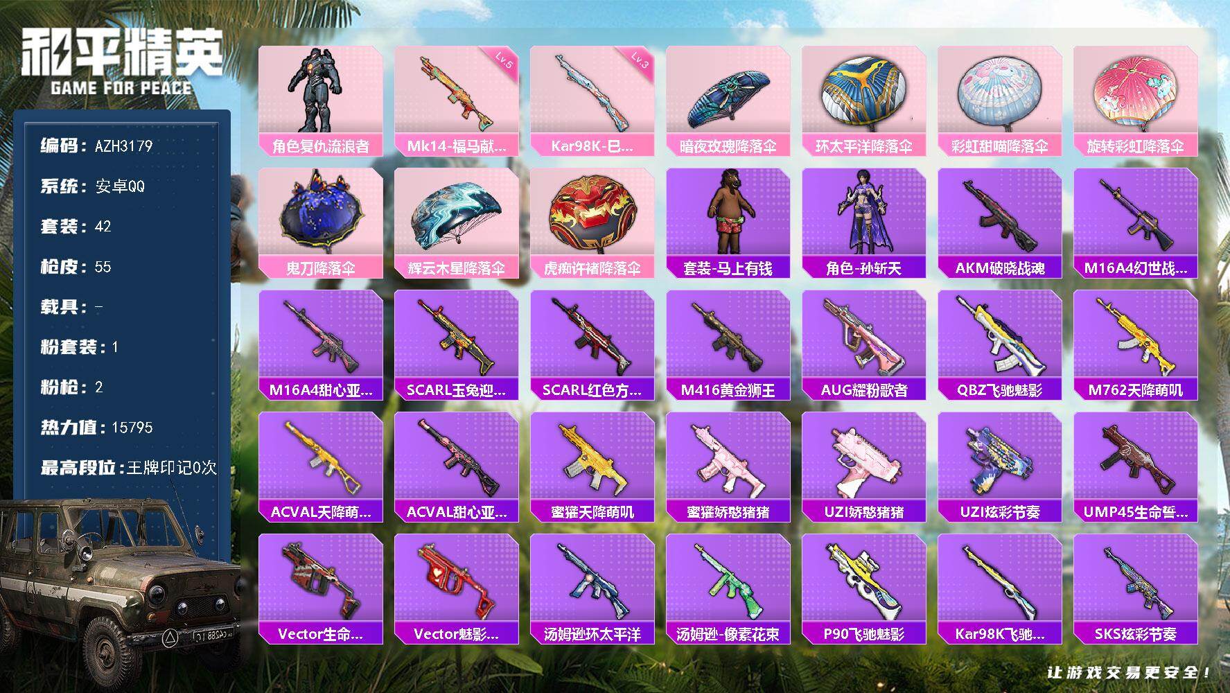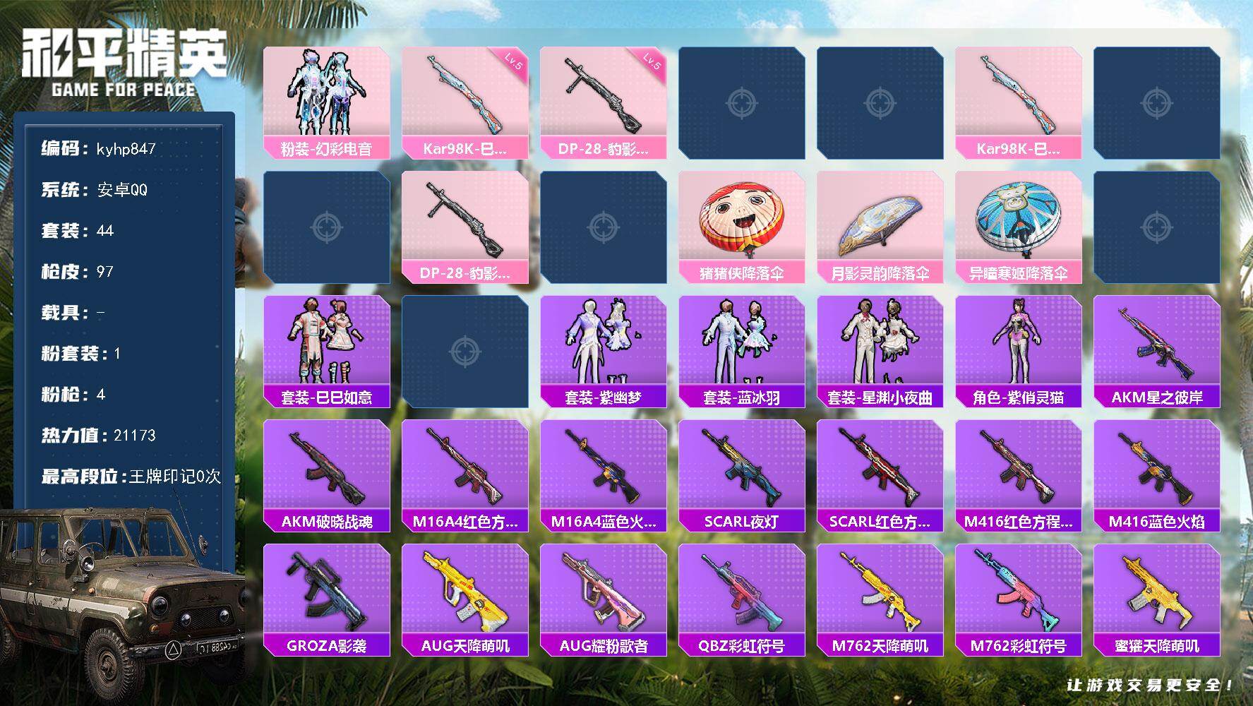 安卓 手Q-1粉装-4特效枪-0载具-1粉色飞行器-21173热力值-0王牌印