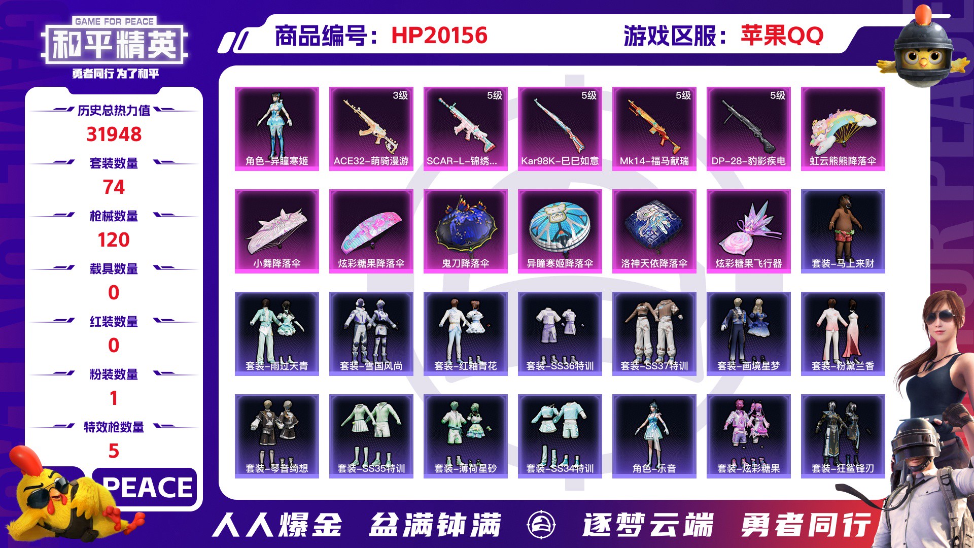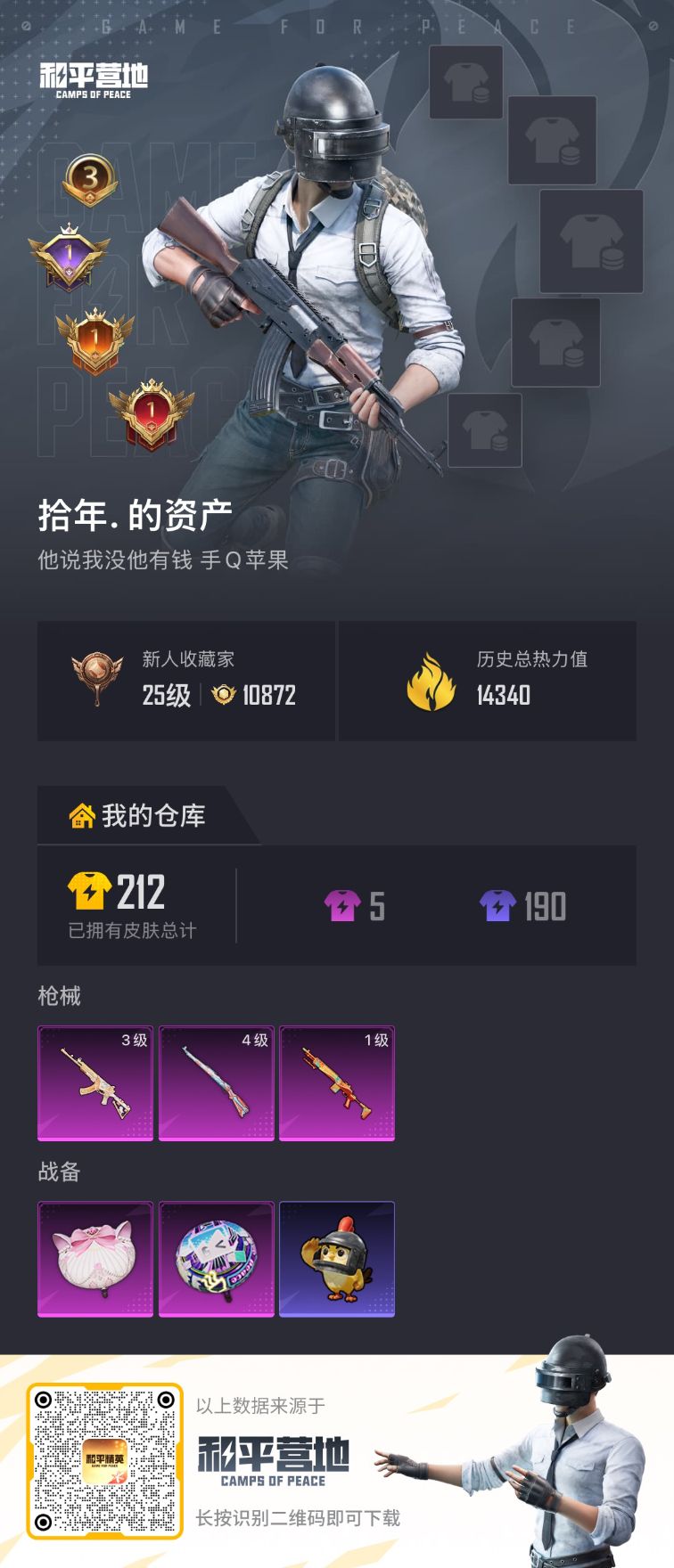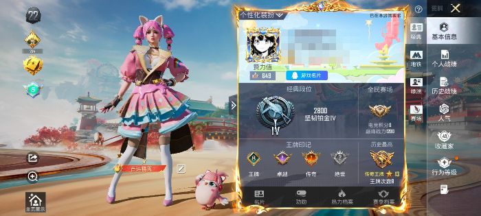 历史总热力值:31948 粉装数量:1 特效枪数量:5 王牌印记:3 历史最高段位:超级王牌5星 套装数量:74 时装数量:298 枪械数量:120 战备数量:72 装备数量:136