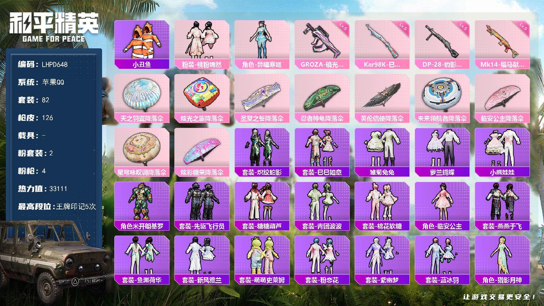 苹果 手Q-2粉装-5特效枪-0载具-0粉色飞行器-52954热力值-1王牌印