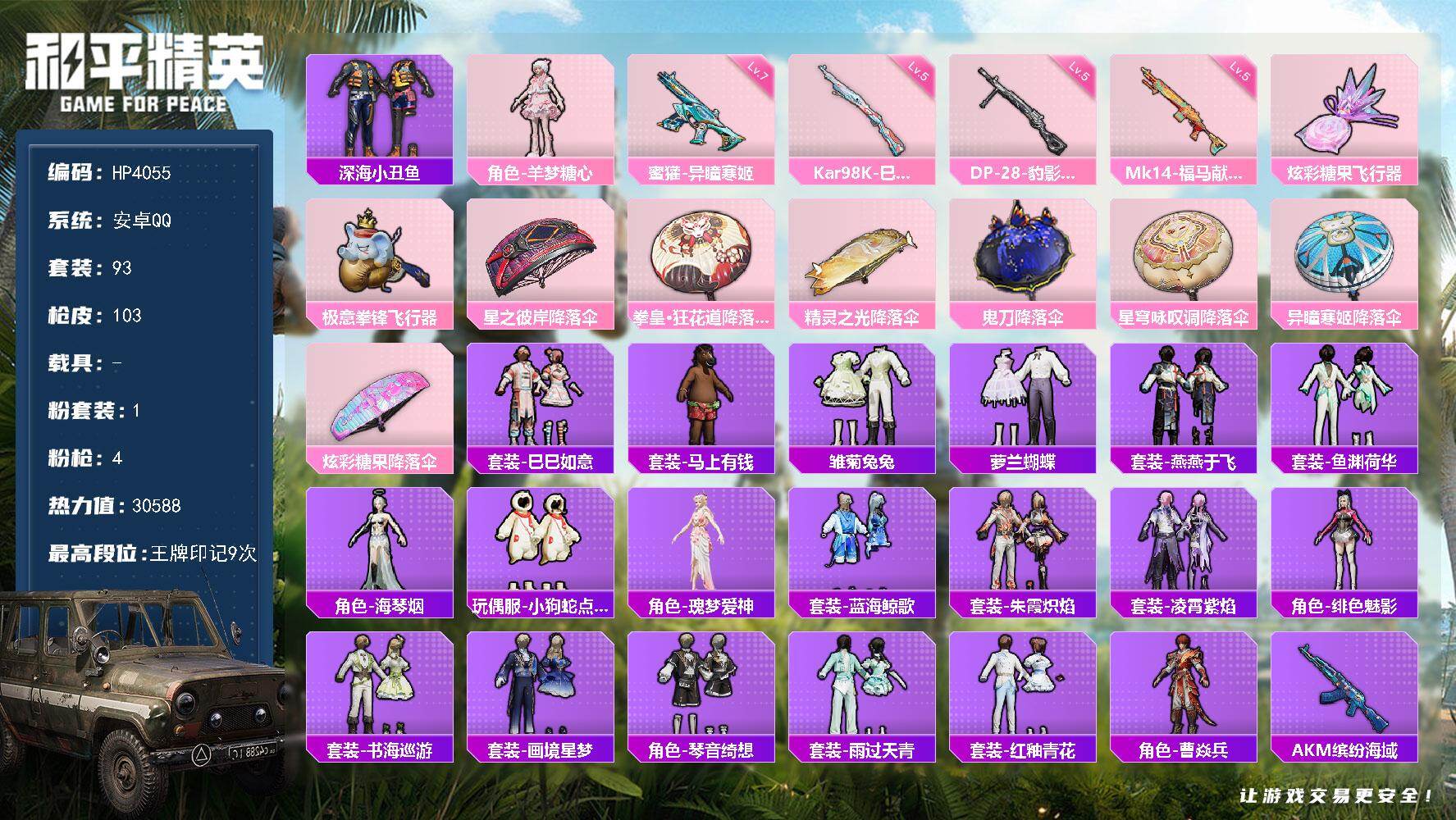 安卓 手Q-1粉装-4特效枪-0载具-2粉色飞行器-30588热力值-9王牌印