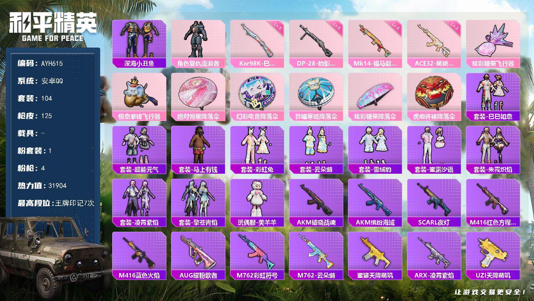 安卓 手Q-1粉装-4特效枪-0载具-2粉色飞行器-31904热力值-7王牌印