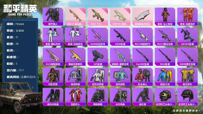 安卓,手Q-2粉装-3特效枪-0载具-0粉色飞行器-21013热力值-1王牌印