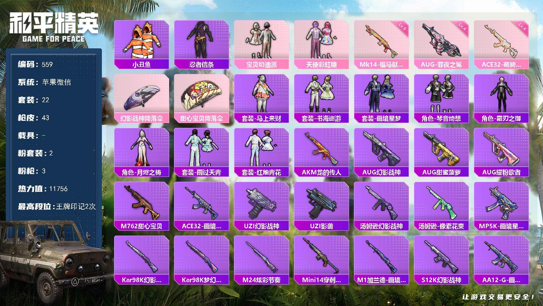 苹果 微信-2粉装-3特效枪-0载具-0粉色飞行器-11756热力值-2王牌印