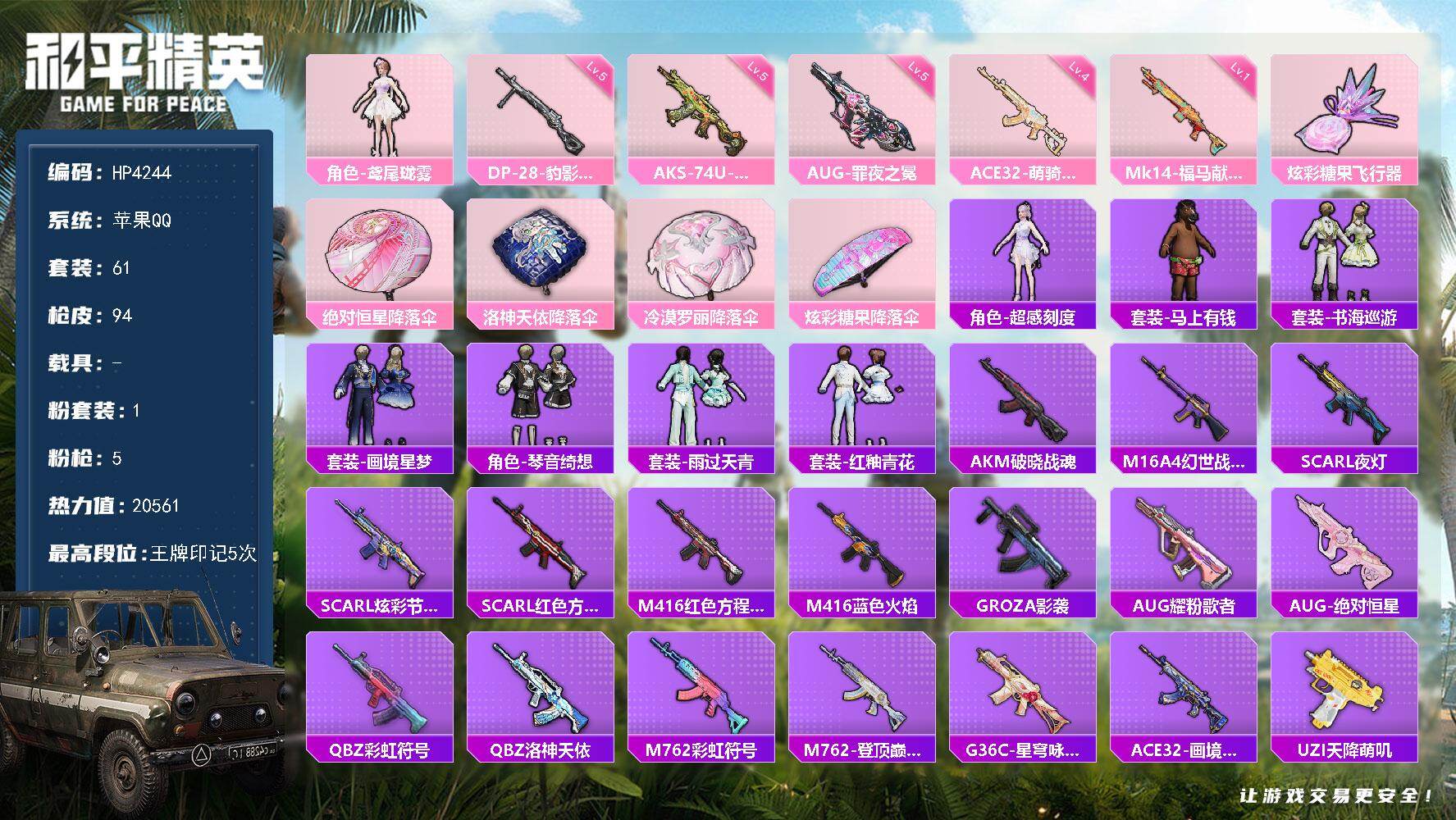 【店主推荐捡漏号!可直接换绑】苹果 手Q-0粉装-3特效枪-1载具-0粉色飞行