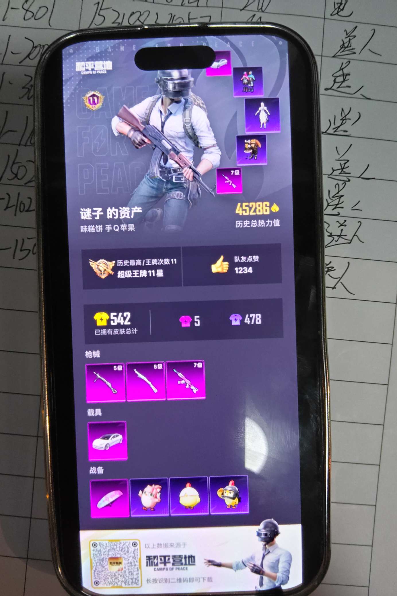 三把满级升级枪,有,浪漫波比,罗小黑套装,十一个王牌印记,四万多热力值有一辆路特斯车皮
