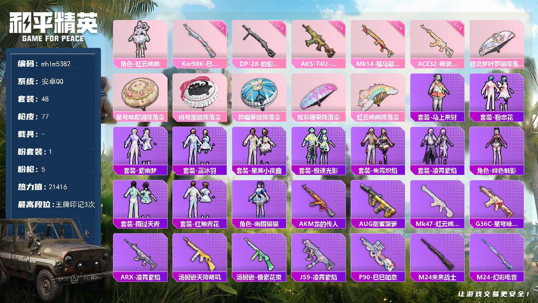 安卓 微信-1粉装-2特效枪-0载具-1粉色飞行器-12789热力值-0王牌印