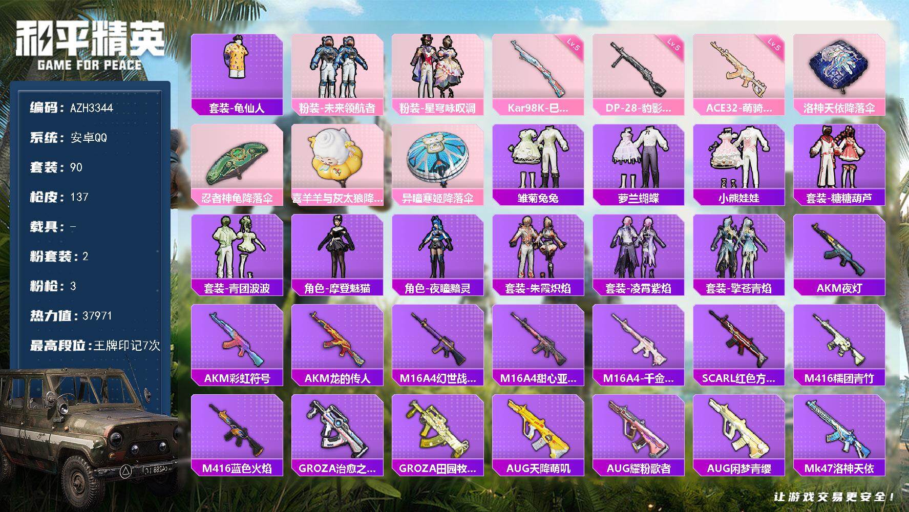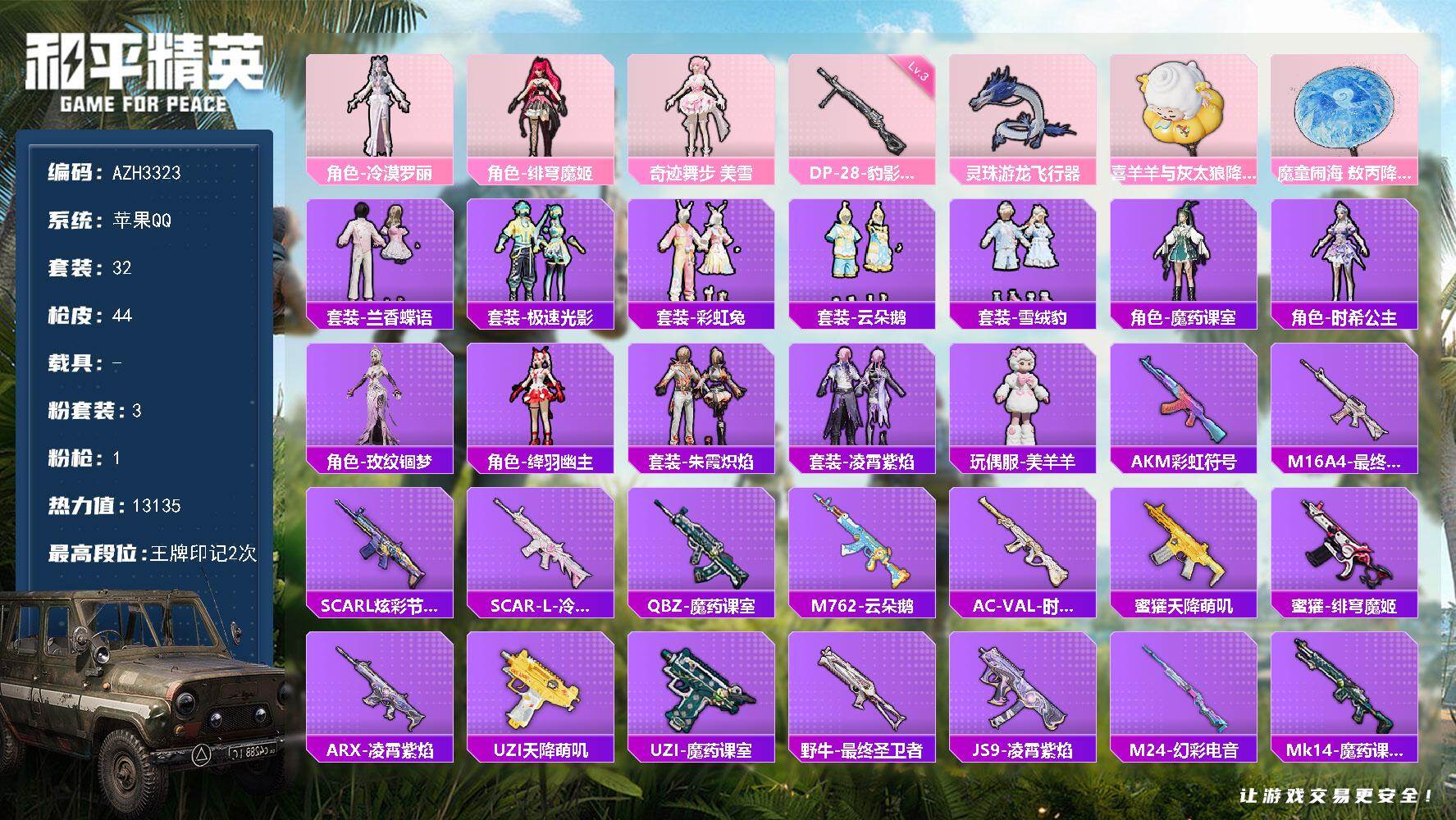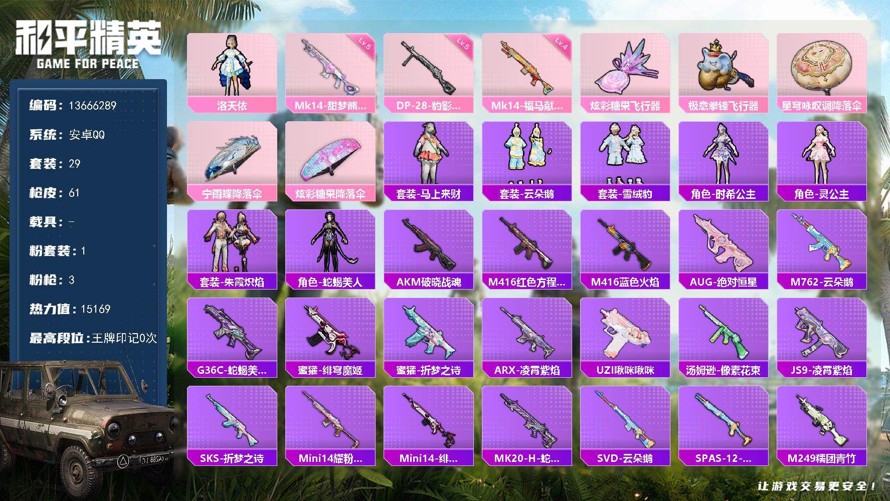 0粉装-3特效枪-0载具-0粉色飞行器-8795热力值-1王牌印记-23套装-36枪皮