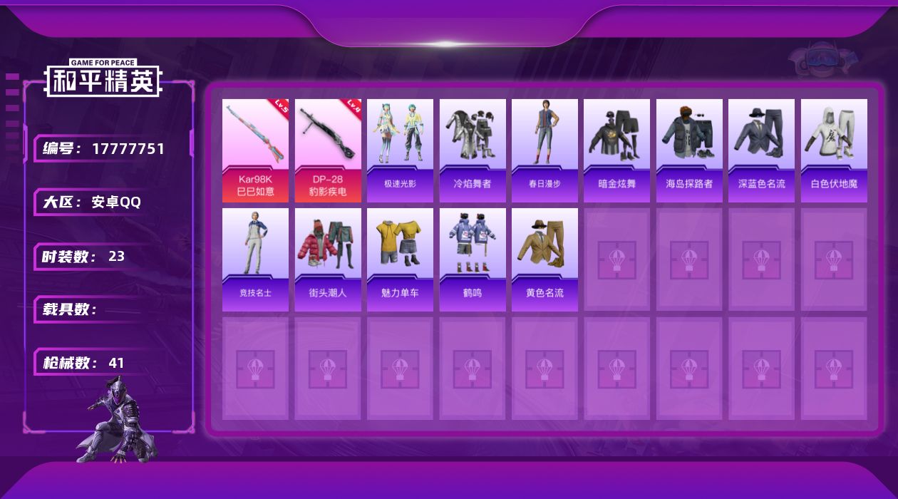 安卓 手Q-2粉装-2特效枪-1载具-1粉色飞行器-25010热力值-2王牌印