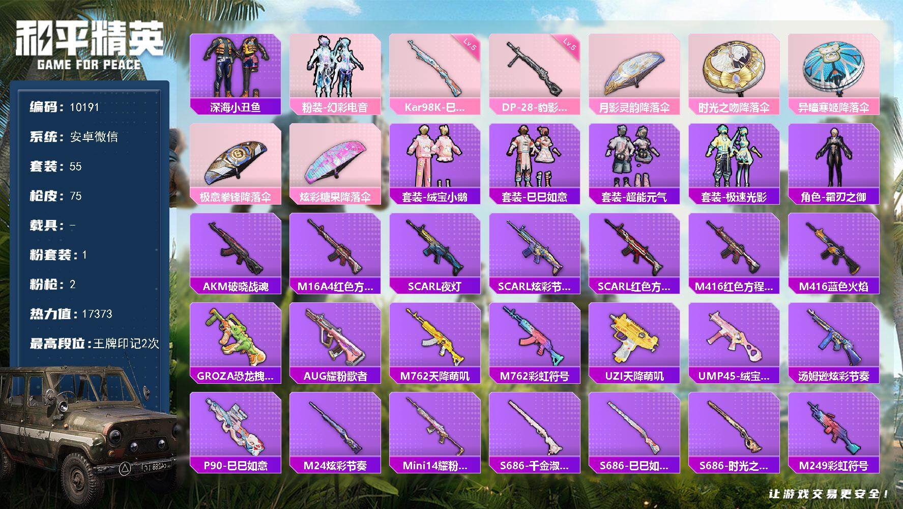 安卓 微信-1粉装-2特效枪-0载具-1粉色飞行器-17373热力值-2王牌印